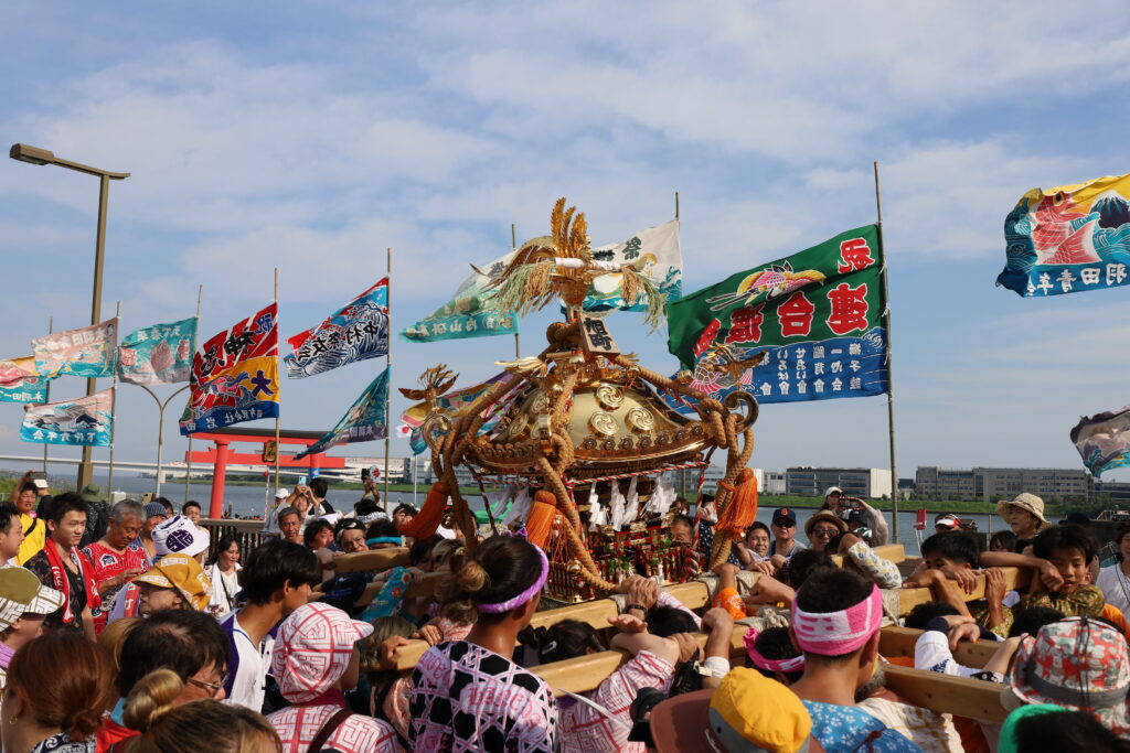 The way to carry a mikoshi is unique to Haneda . it is called “Yokotakatsugi” which represents the fishing industry expressing a small boats floating on rough sea waves. Decorations in the town imitating the flag and lanterns that decorated the fishing boats are also impressive.