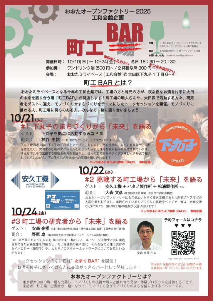 ・10/21(火)#1「下丸子のまちづくりから『未来』を語る」(ゲスト:下丸子を拠点に活動する皆さま)・10/24(金)#3「町工場の研究者から『未来』を語る」(ゲスト:安森亮推)