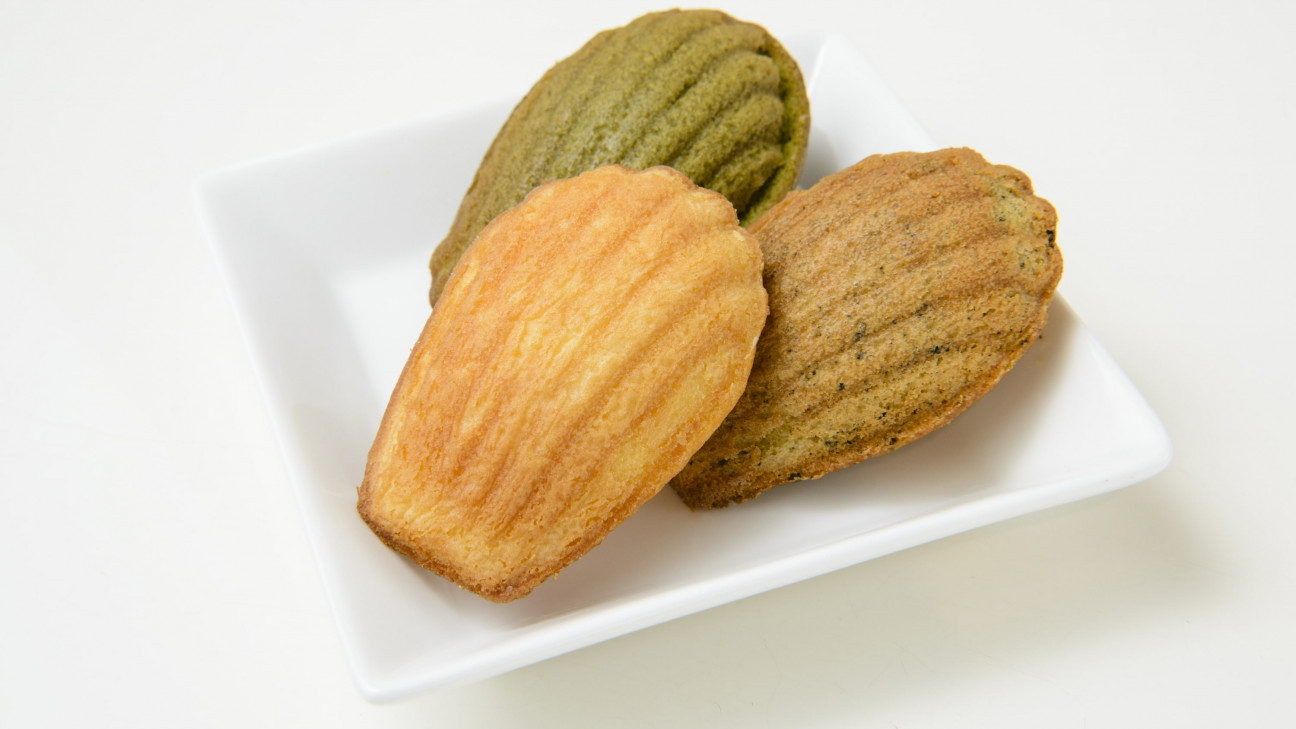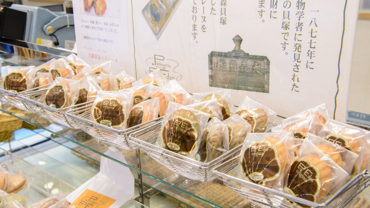 5種類の和の素材(かぼちゃ、黒ゴマ、抹茶、黒糖、ハチミツ)を使った「大森貝塚マドレーヌ」は、しっとりとした食感と上品な甘さが人気です。