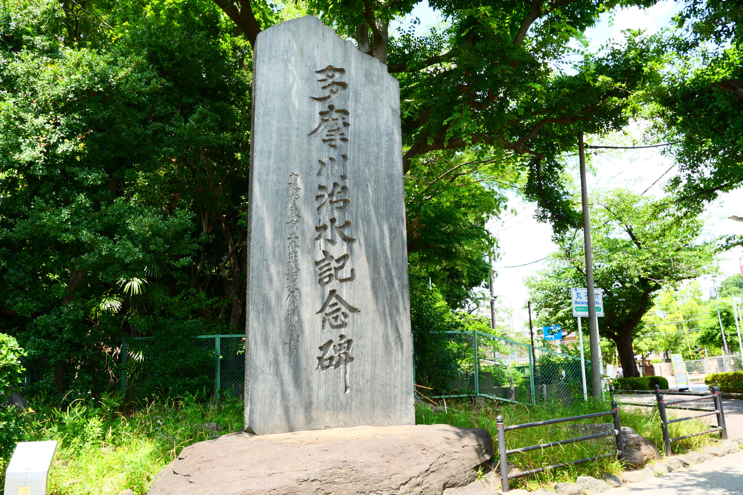昭和11年(1936年)、多摩川の治水工事の竣工を記念して建てられたもの。工事は、大正7年(1918年)羽田の河口部から開始し、昭和9年(1934年)世田谷区砧までの間が完成した。