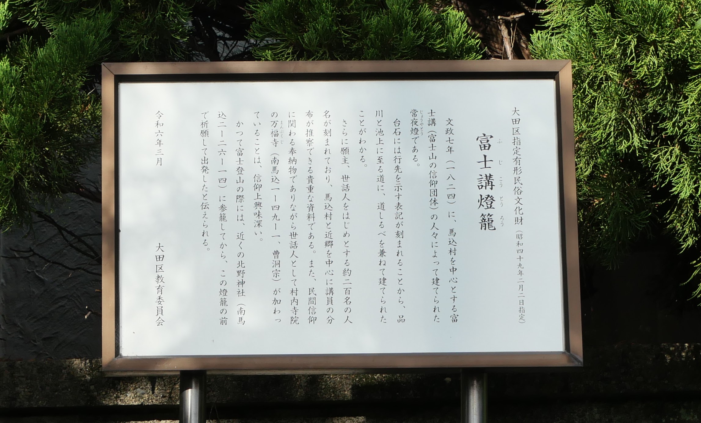 文政7年(1824年)に、馬込村の富士講の人々が中心となって建てたもの。道しるべと常夜燈を兼ねている。区指定文化財。