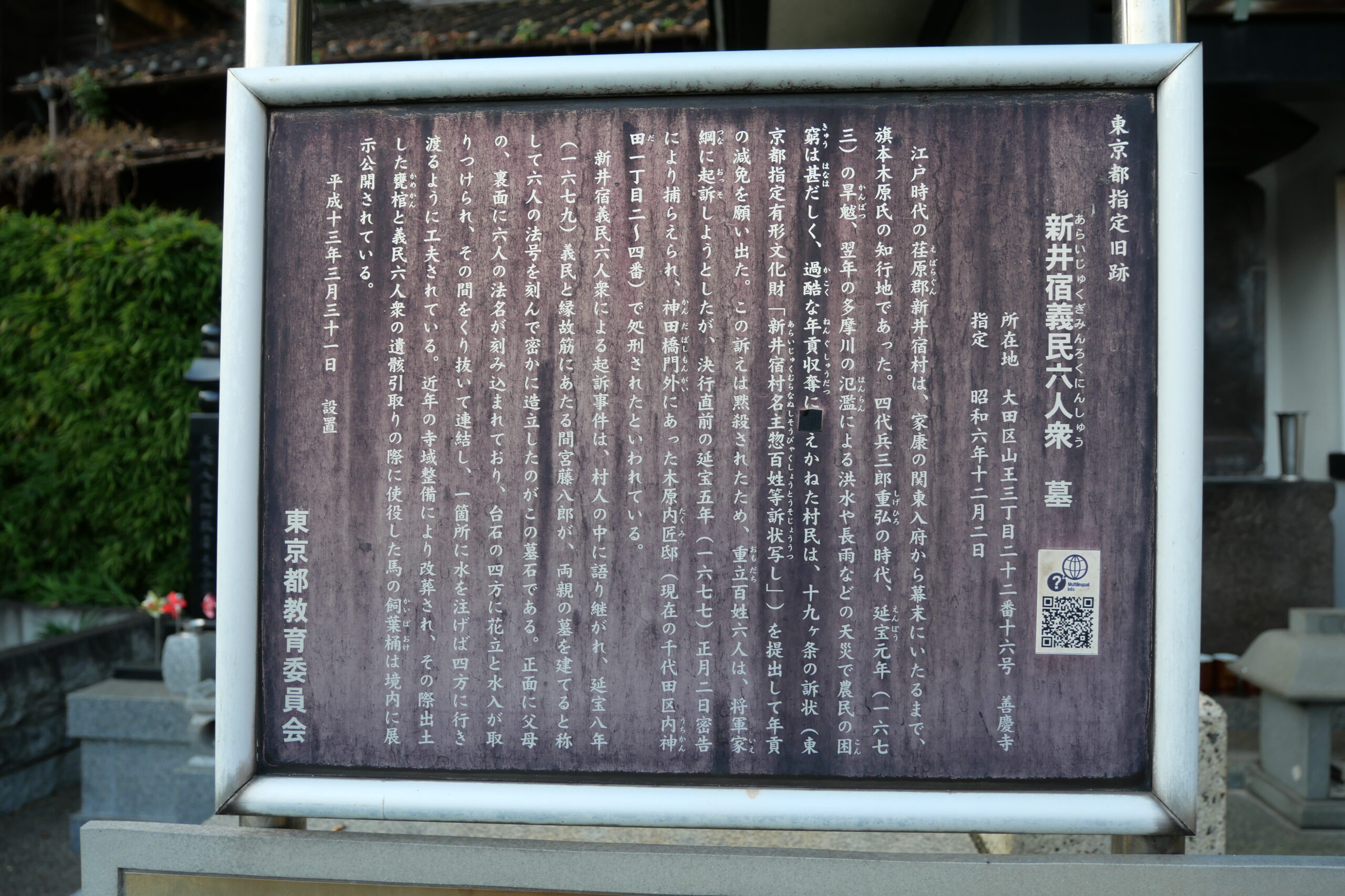 新井宿村の農民は、延宝年間(1673~1681年)に領主の厳しい年貢の取立てに耐えかねて、村役人6人が直訴を計画。しかし事前に知られ、6人全員が斬罪に処せられた。村人が、父母の墓という名目で建てた墓石には、墓参すると義民六人衆を同時に供養できる工夫がされている。都指定文化財。