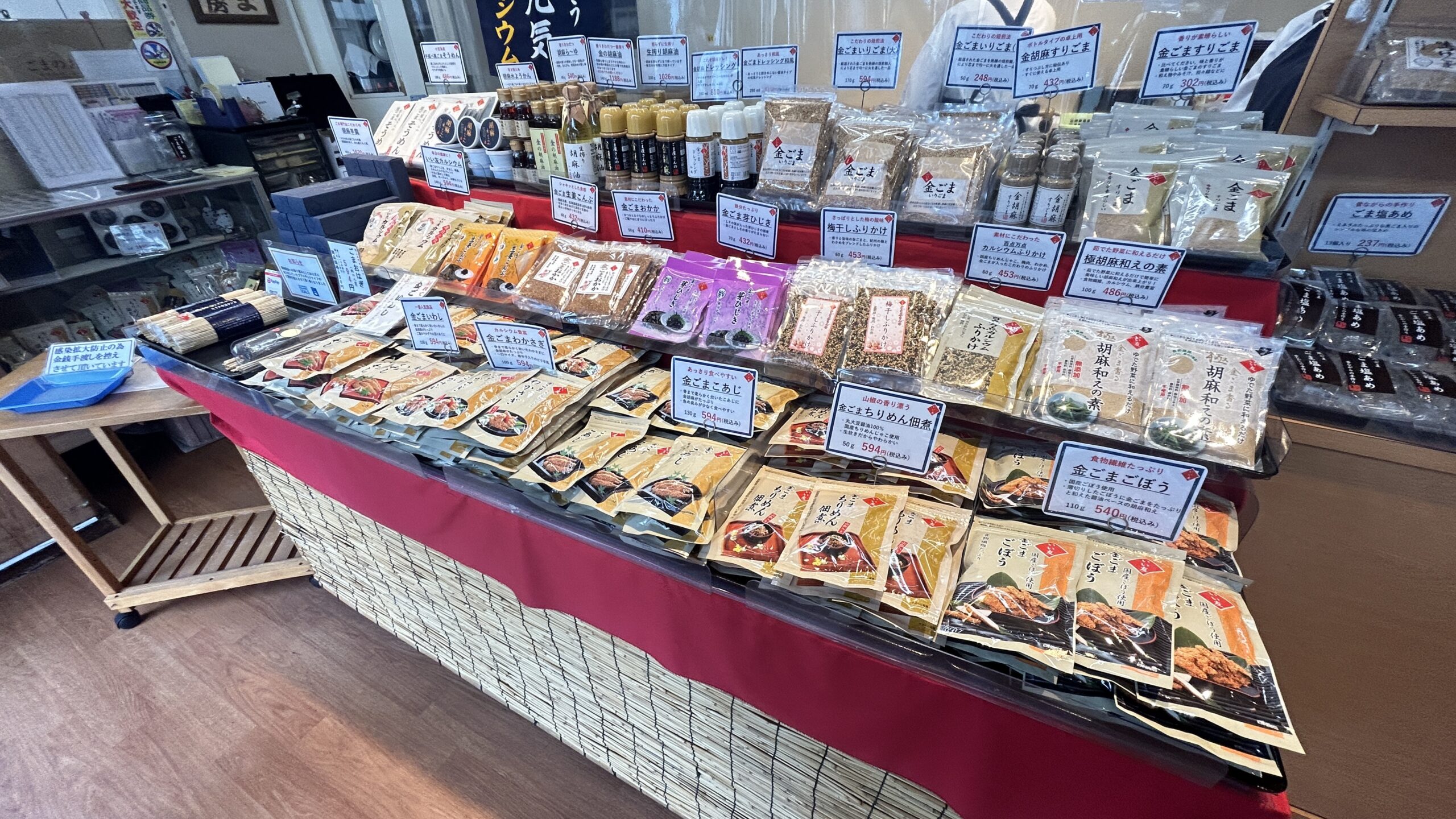 すりごまからドレッシング、炊いた魚とあえたもの、ようかん、クッキーまで約40種類の商品が並ぶ。どれも身体に良いこと間違いなし。本門寺で心を清め、こちらの商品で身体もスッキリ。