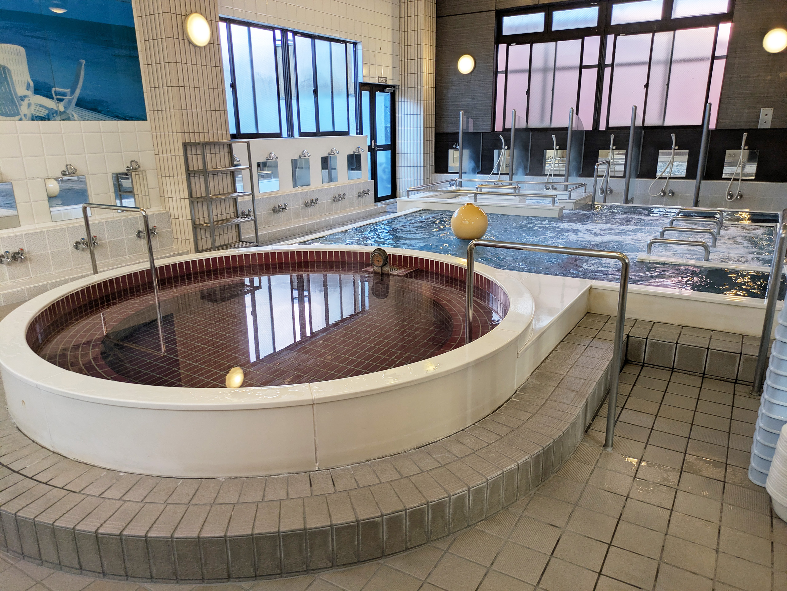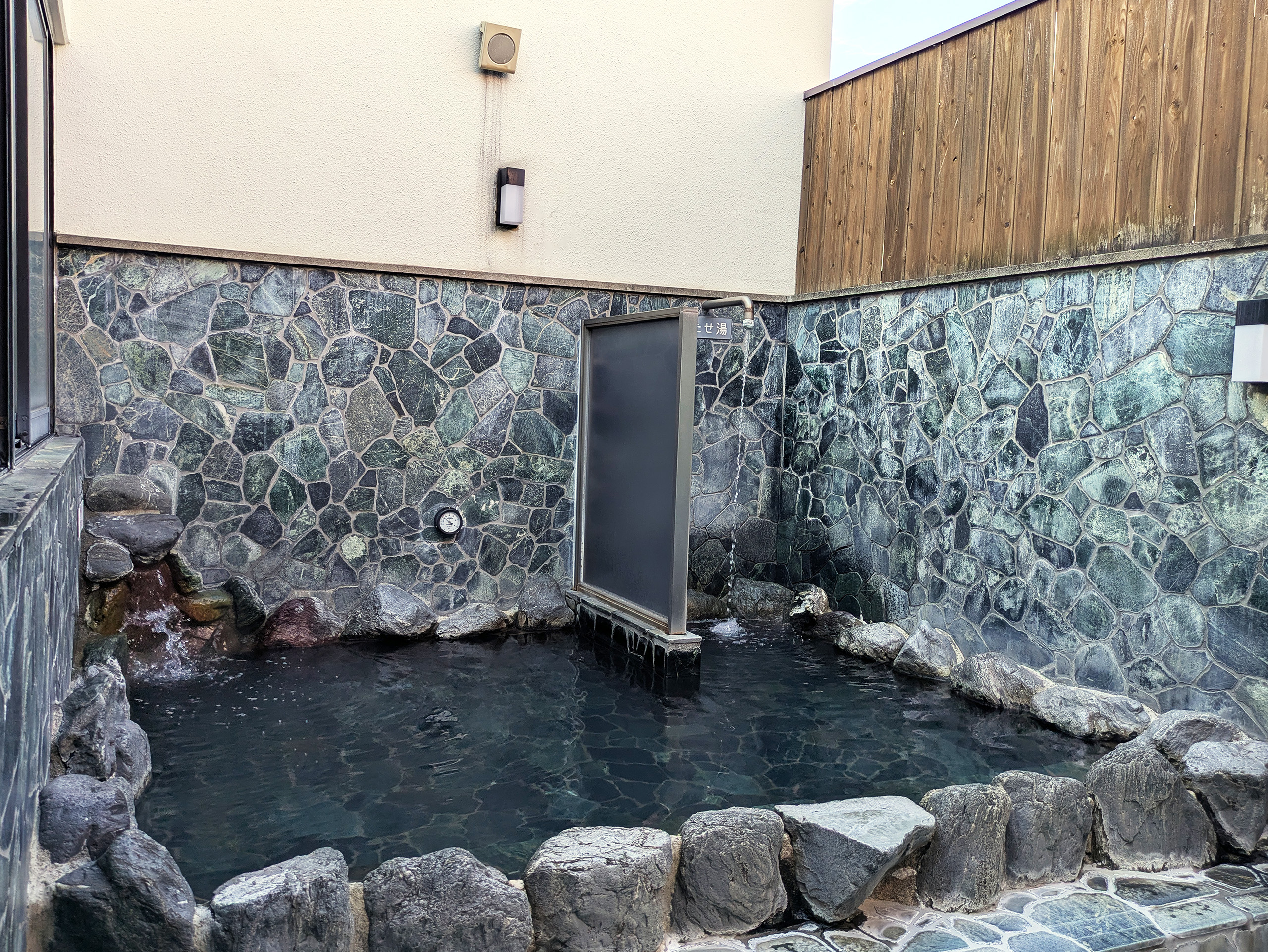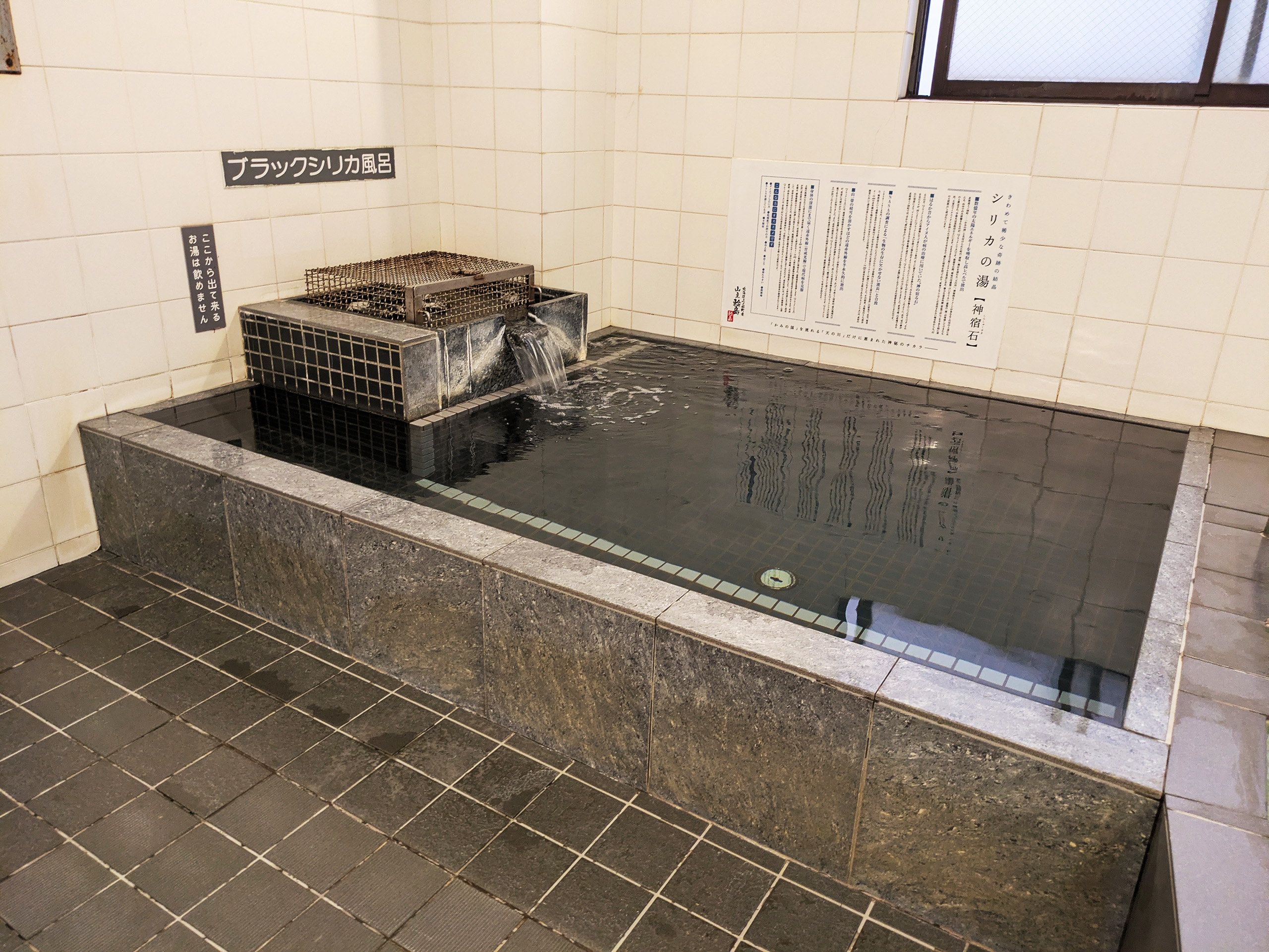男女日替わりで1階・ブラックシリカ風呂と2階・露天風呂が楽しめる。朝風呂も。サウナ、駐車場あり。