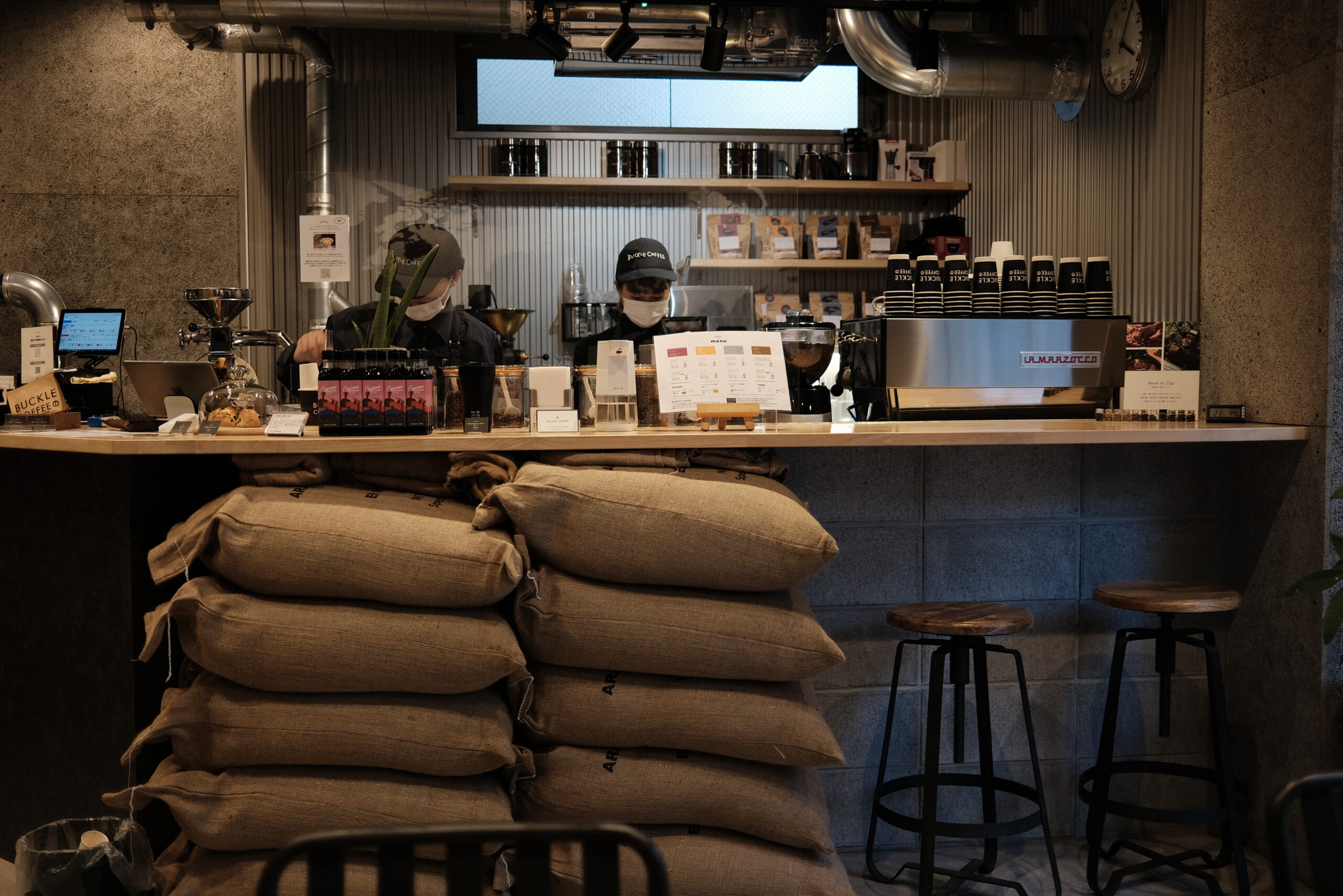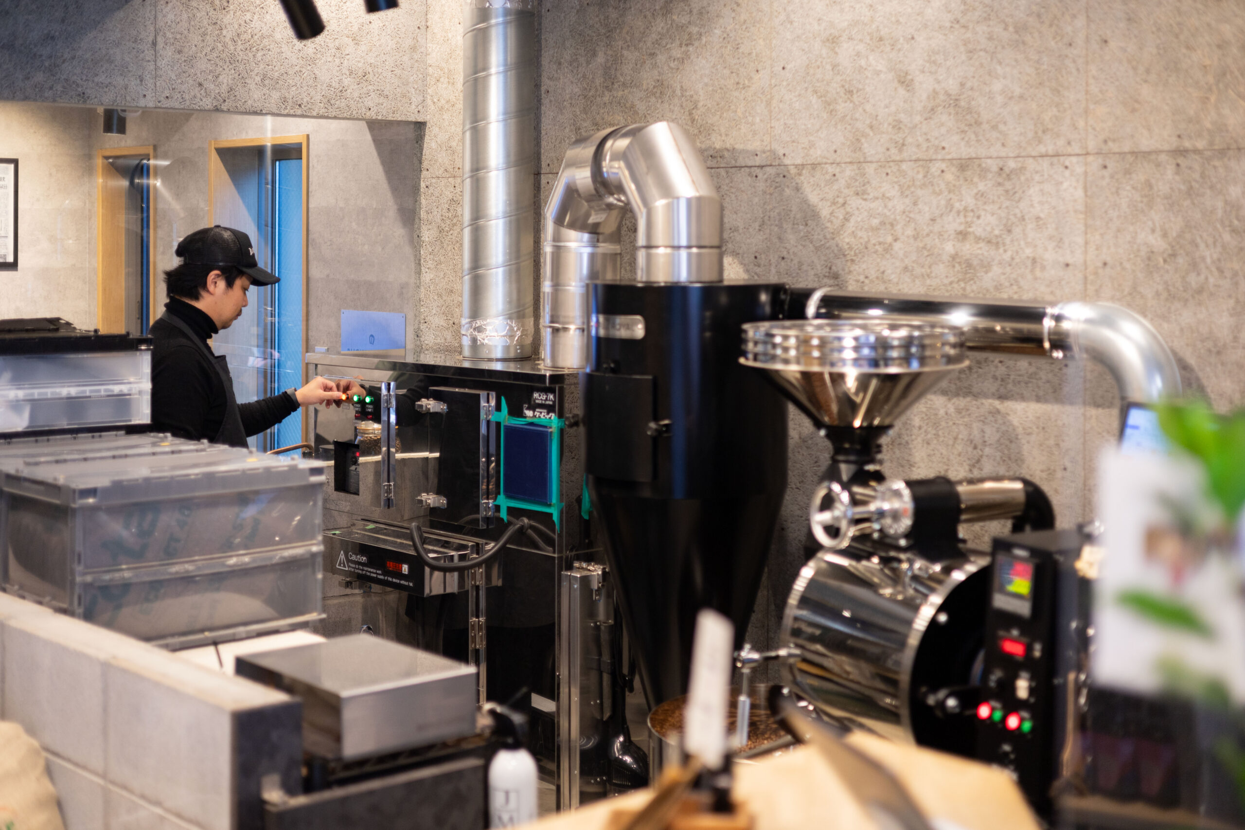 カウンター奥に製造機が鎮座し製造風景をご覧になりながら各国の美味しいコーヒーをお楽しみいただけます。