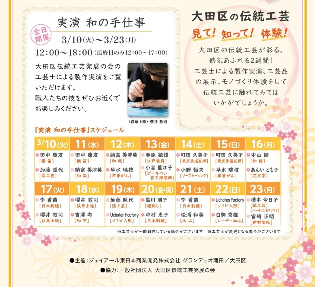 "Ota Culture Week in GRANDUO" will be held in the east-west connecting corridor on the 3rd floor of GRANDUO Kamata, where you can experience the charm of Ota Ward's traditional crafts. During the event, traditional craftsmen will demonstrate their work and exhibit their works. In addition, on weekends and holidays, there will be workshops taught by artisans (participation is free, and the event will end while materials last). Why not experience the skills of artisans that have been passed down through the generations up close and enjoy a life with traditional crafts in your own home?
