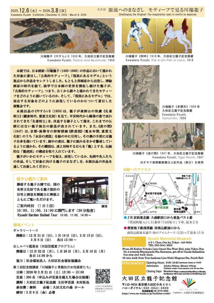 This exhibition focuses on the subjects depicted by Japanese painter Kawabata Ryushi, showcasing his work from two perspectives: "classical motifs" and "real-life models." Works on display highlight Ryushi's unique creativity and powers of observation, including "Yasarai," a reinterpretation of the Peacock Myoo statue from the Heian period as a figure quietly resting, and "Tiger Room," in which he quotes Nanzenji Temple's "Group of Tigers" and confronts himself with a tiger.