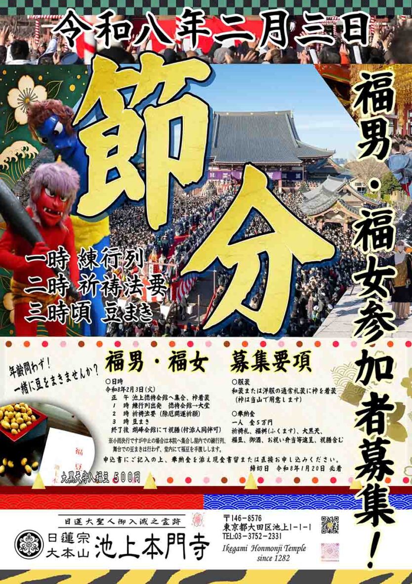 今年も多くの著名人が参列!池上本門寺の豆まき! 今年も除災得幸を願う節分追儺式(せつぶんついなしき)法要と福男・福女による豆撒きを行います。 また、今年も吉例出仕として多数の芸能界・スポーツ界の方...