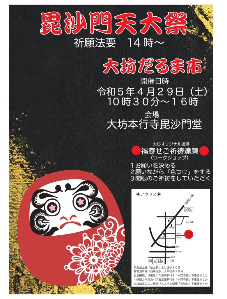 日蓮宗本山 池上 大坊本行寺にて人々の健康と幸福、世界の平和を祈願して「毘沙門天大祭・大坊だるま市」が初開催されます。