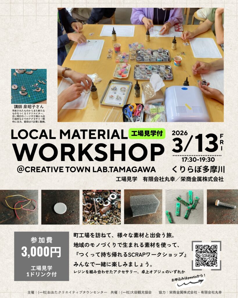 日本有数のモノづくりのまち・大田区。武蔵新田駅徒歩5分の「くりらぼ多摩川」で、町工場の技術と素材に触れる特別な夜を開催します。有限会社丸幸のガスケット製造、栄商金属株式会社の三次元測定やリバースエンジニアリングなどの現場を見学後、講師・泉昭子さんによる工場から出た廃材・「SCRAP」を使ったワークショップへ。