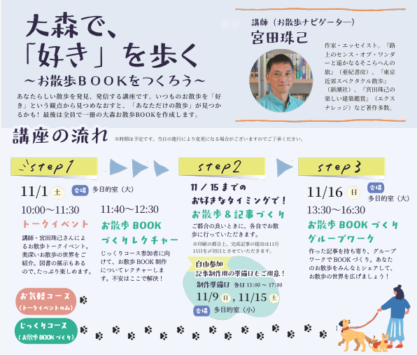 「トークイベント」+別日開催のグループワークにもご参加いただく『じっくりコース』にご参加の方には、お散歩中に気づいたことを記事にするお散歩BOOKづくりをしていただきます。