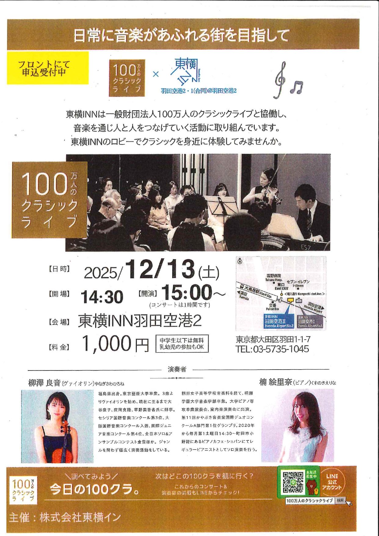 日常に音楽があふれる街を目指して 東横イン羽田空港Ⅱでクラシックライブが開催されます。 東横インのロビーでクラシックを身近に体験してみませんか? 宿泊者以外の方も参加OKですので、お近くのお住いの方...