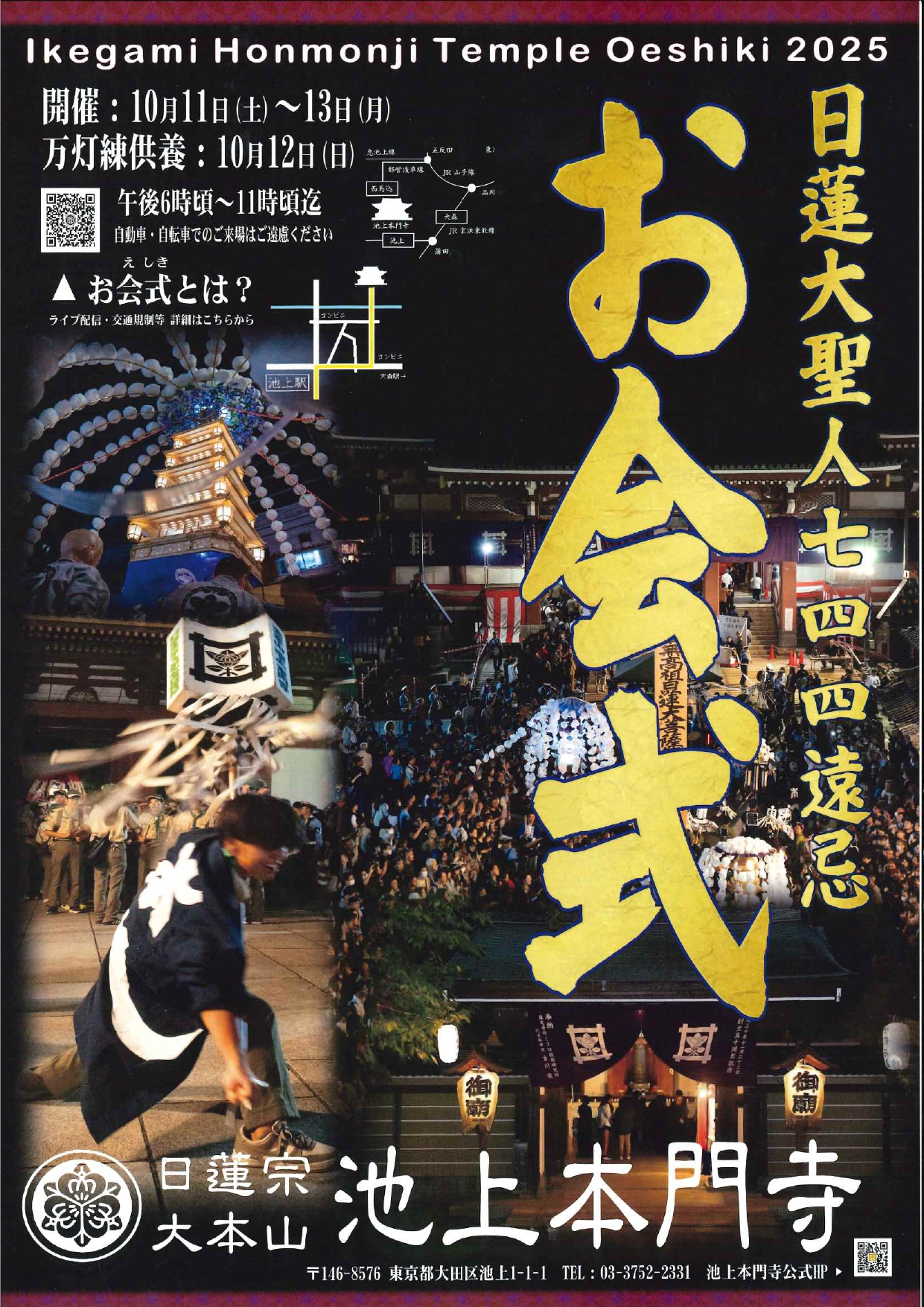 池上がゆれる、祈りと熱気の三日間。 日蓮聖人ご入滅の霊跡・池上本門寺で毎年10月に営まれる「お会式」は、全国の日蓮宗寺院の中でも最も盛大な法要です。11日から法要が始まり、12日夜には約2キロを百数十講中・三千人の万灯...