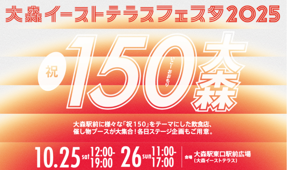大森駅開業150年を目前に、 「祝150」をテーマにした催しや飲食店が大集合! 2026年に大森駅は開業150周年を迎えます。 この大切な節目を盛り上げるイベントが大森駅東口「イーストテラス」で地元の方々によって開催さ...