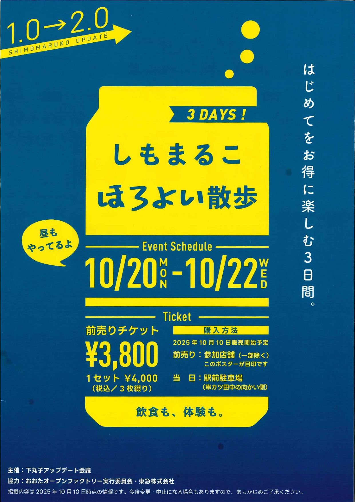 はじめてをお得に楽しむ3日間 2025年10月20日(月)~22日(水)で下丸子駅周辺の店舗を対象とした「しもまるこほろよい散歩」が開催中です! お得なチケットで下丸子の飲食や体験を楽しもう! 開催日時 2025...
