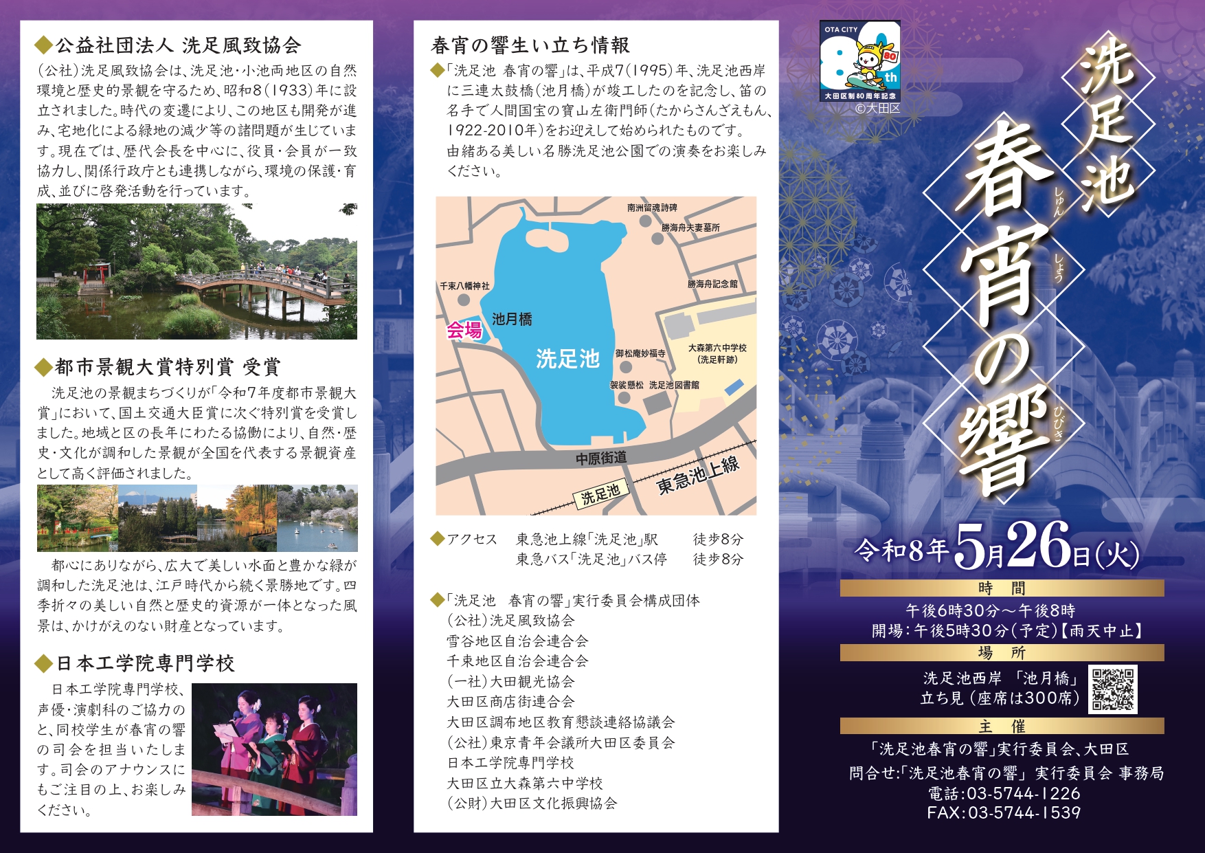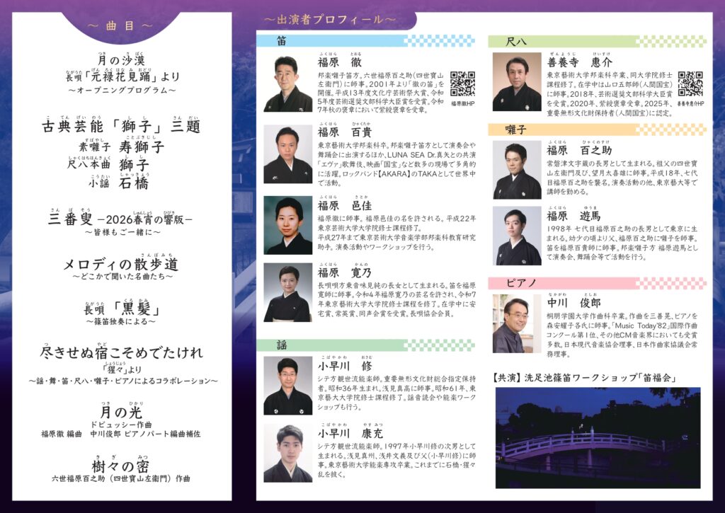 「洗足池 春宵の響」は、平成7年に洗足池西岸に池月橋が竣工したことを記念し、笛の名手で人間国宝の寶山左衛門氏をお迎えして始まりました。