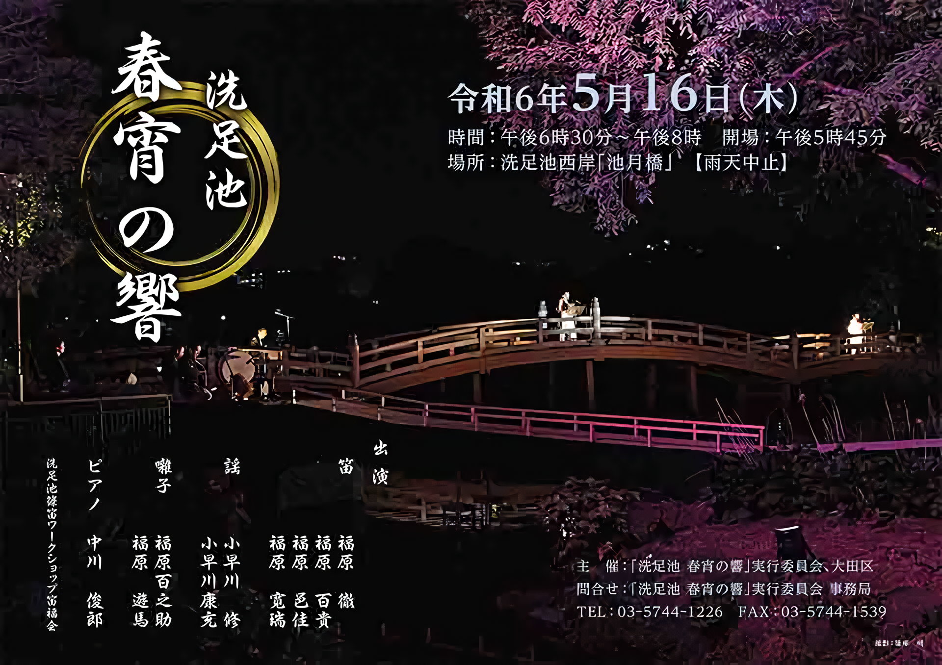 「洗足池 春宵の響」は、平成7年に洗足池西岸に池月橋が竣工したことを記念し、笛の名手で人間国宝の寶山左衛門氏をお迎えして始まりました。