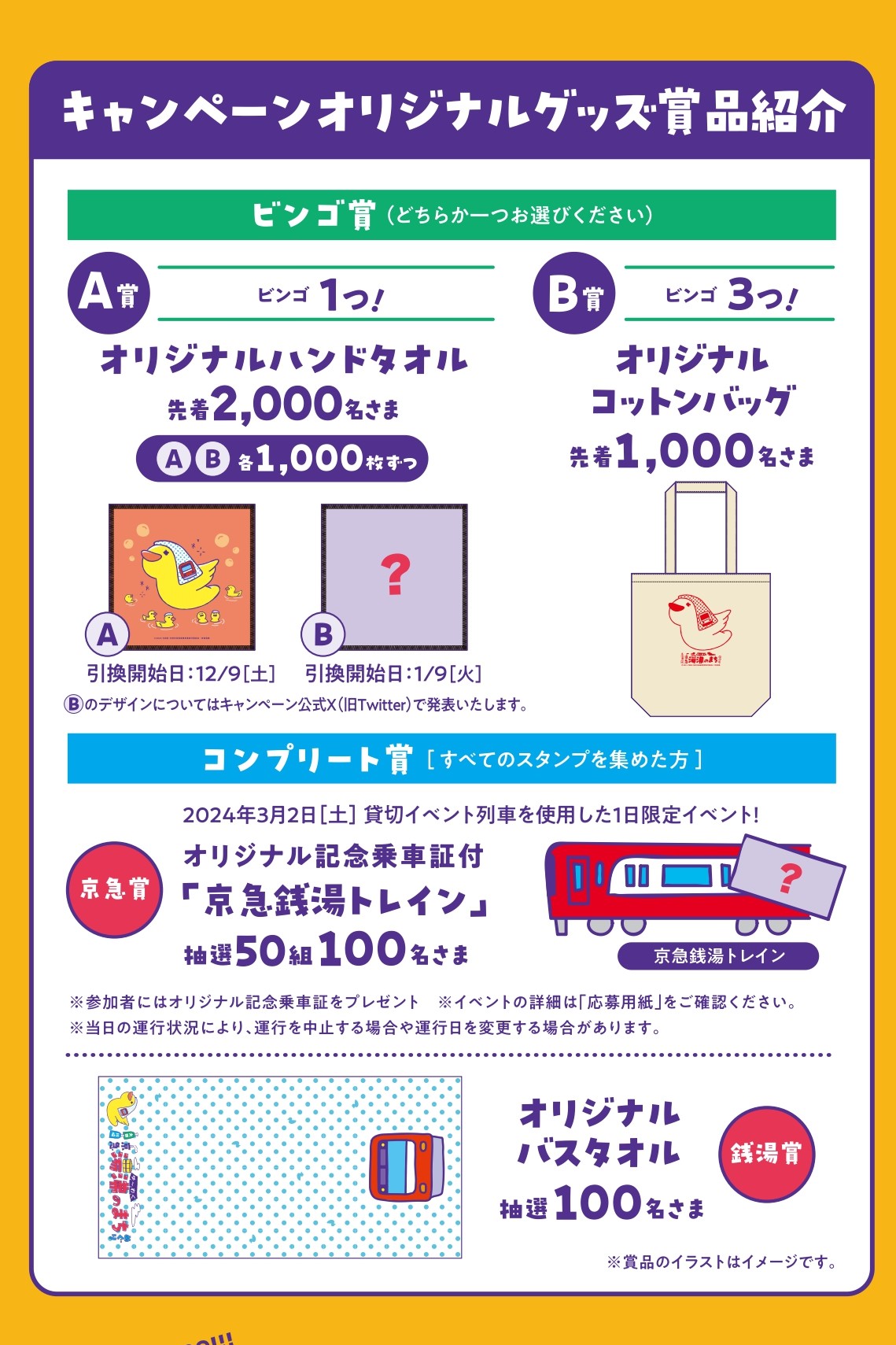 全てのスタンプを集めた方にはコンプリート賞として抽選で京急線の貸切列車「京急銭湯トレイン」へのご招待券やオリジナルバスタオルをプレゼント!