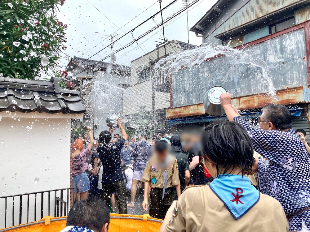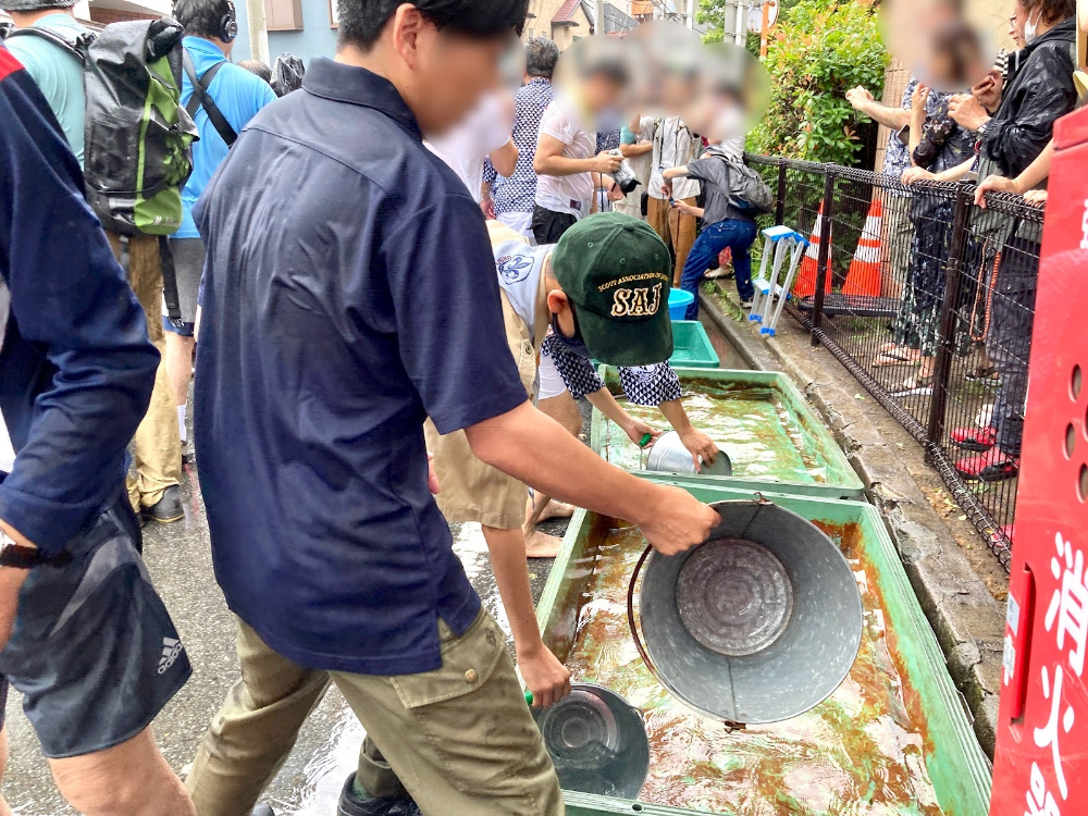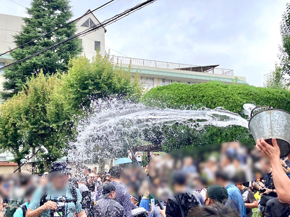 バケツに入ったたっぷりの水をぶちまけるみなさん。「ぶちまける」という言葉が似合ってしまうほど清々しい掛けっぷりです。