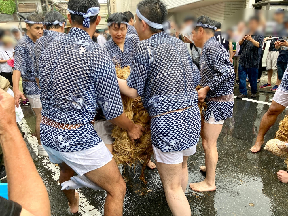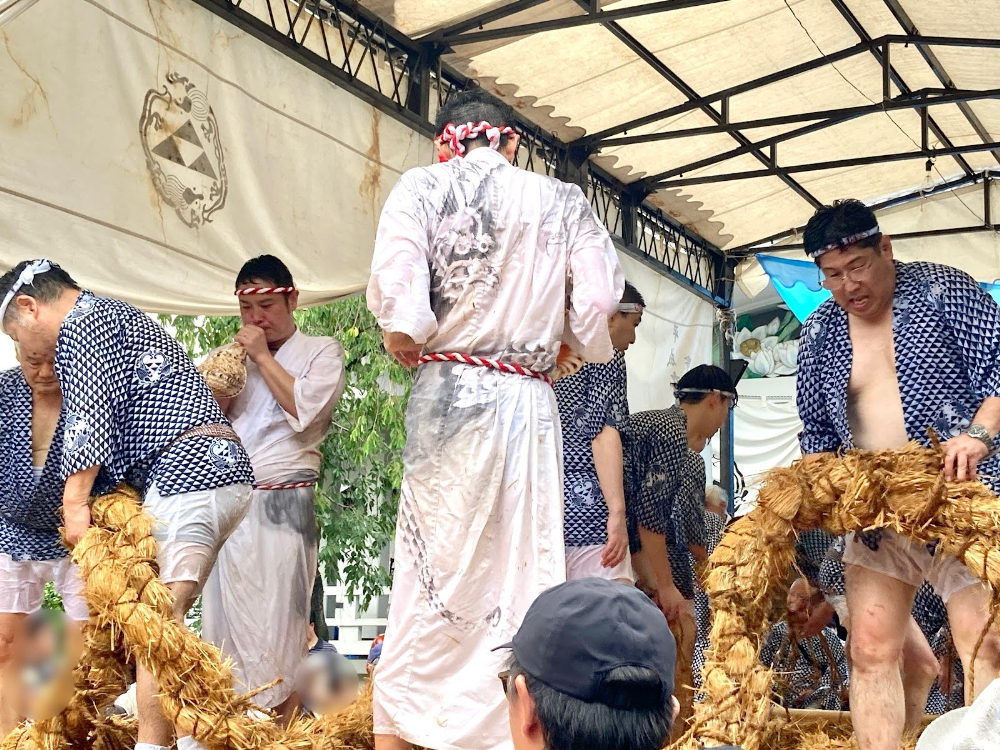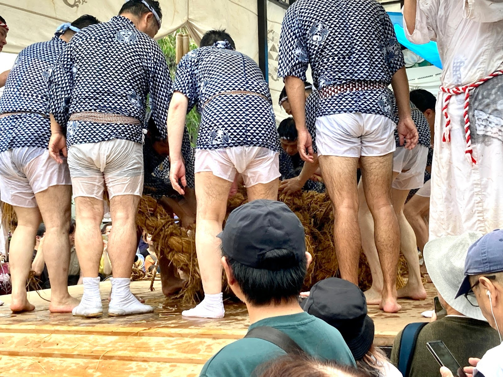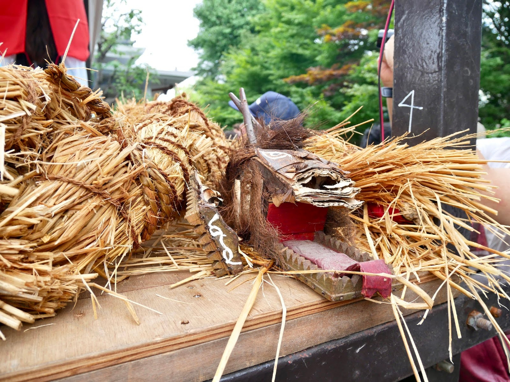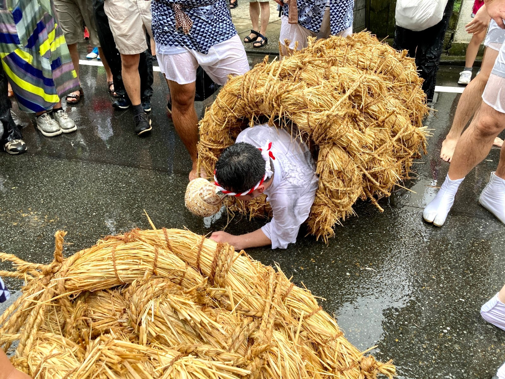 巻き上げて筒のようにした藁の縄を、龍神に見立てます。このなかに人が入り、水を掛けられるたびに法螺貝を吹くことで、喜んで雄叫びを上げる龍神の様子を表現するんだそう。