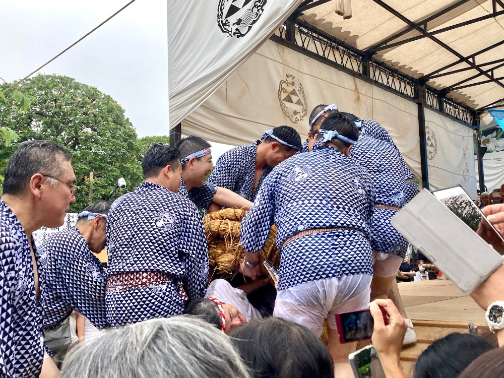 厳正寺に入ると水は止み、藁は舞台へと運ばれます。龍神は舞台に上がると体が解かれてしまうそうで、必死に身をよじって抵抗します。周りの人が「おお~暴れてるぞ~! 」と実況して盛り上げていました。みんなでひとつの物語を作っているような感覚になります。