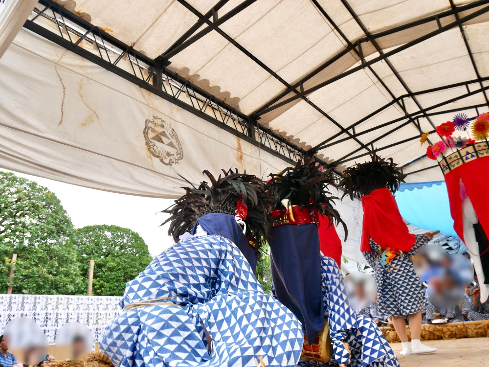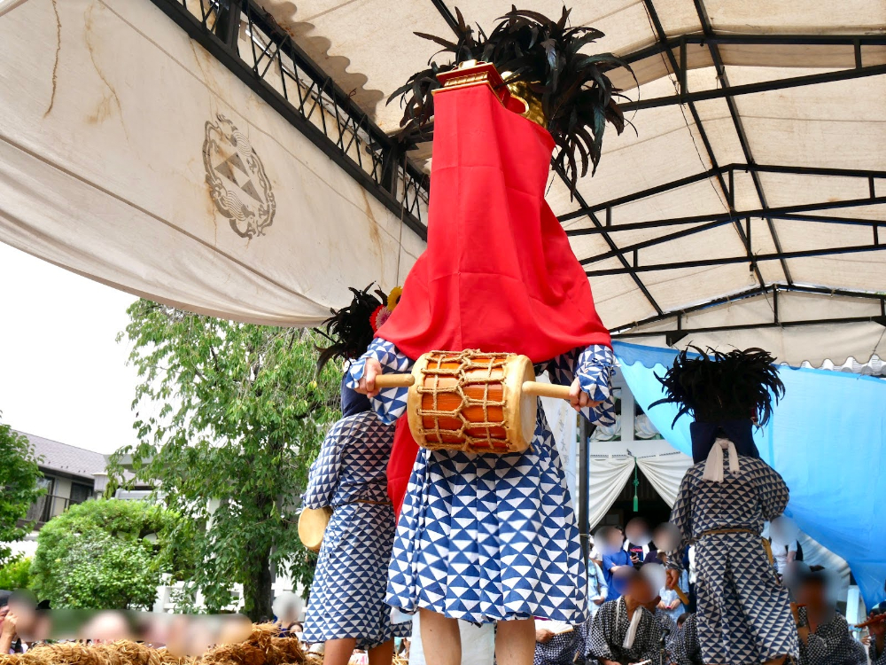 雨止めの儀式で奉納されるのは、その名も「水止舞」。この行事の本編とも言えるでしょう。みなさんがイメージする一般的な「獅子舞」とは、ビジュアルも内容もきっと違うと思うので、ぜひ足を止めて水止舞ワールドに浸ってみてください。