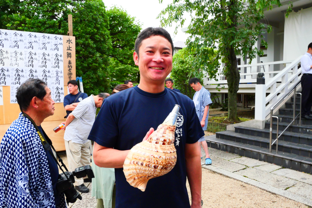 スッキリした快活な笑顔で来てくれたのは、道行で法螺貝を吹いていた山田さん。水止舞が終わった直後でお疲れのところ、少しだけインタビューのお時間をいただきました!