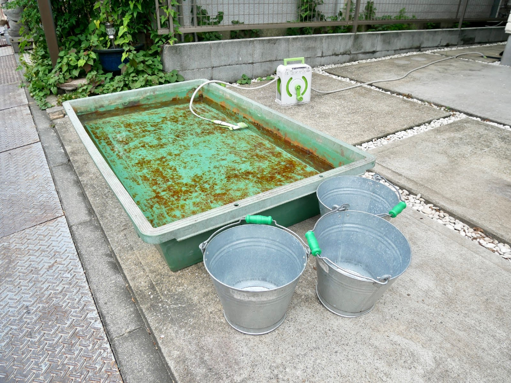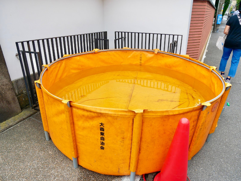 そして、その隣にはたっぷりと水を張った桶や水槽があります。