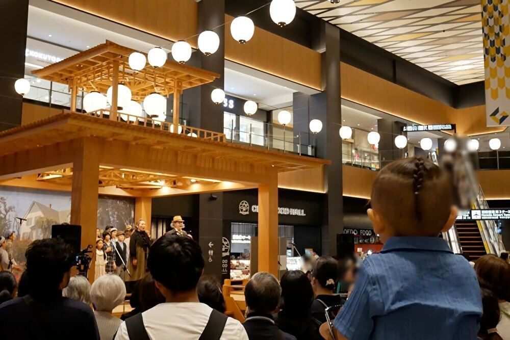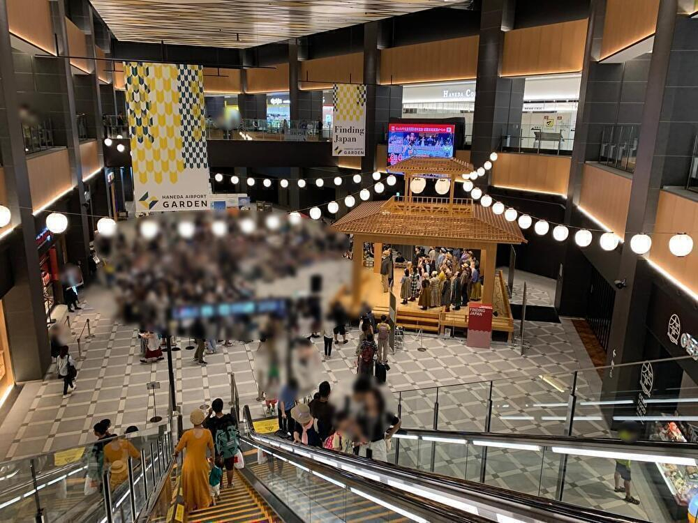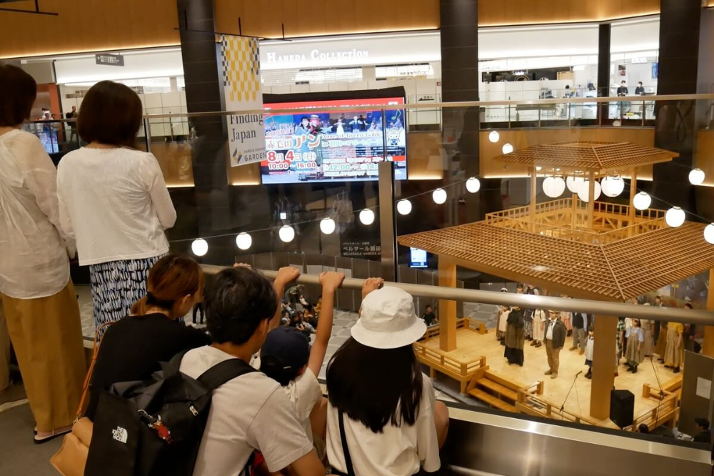 エスカレーターを下った1階のグランドホワイエ中央にあるやぐらステージ。実際に見るとその存在感は圧巻で、周囲にはレストランがあるため、外国人観光客の方々も行き交う場所です。