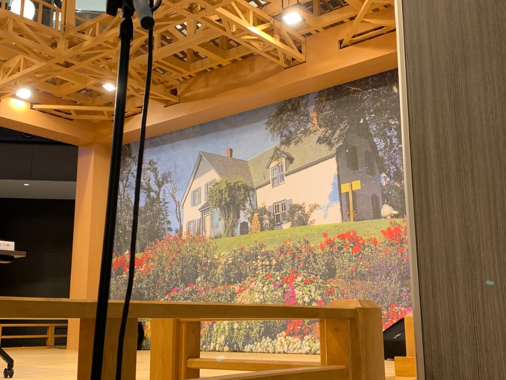 そして普段のやぐらステージは松の絵が描かれていますが、今日は、カナダのプリンス・エドワード島にあるアンの家のモデル「グリーンゲイブルズ」の写真に!