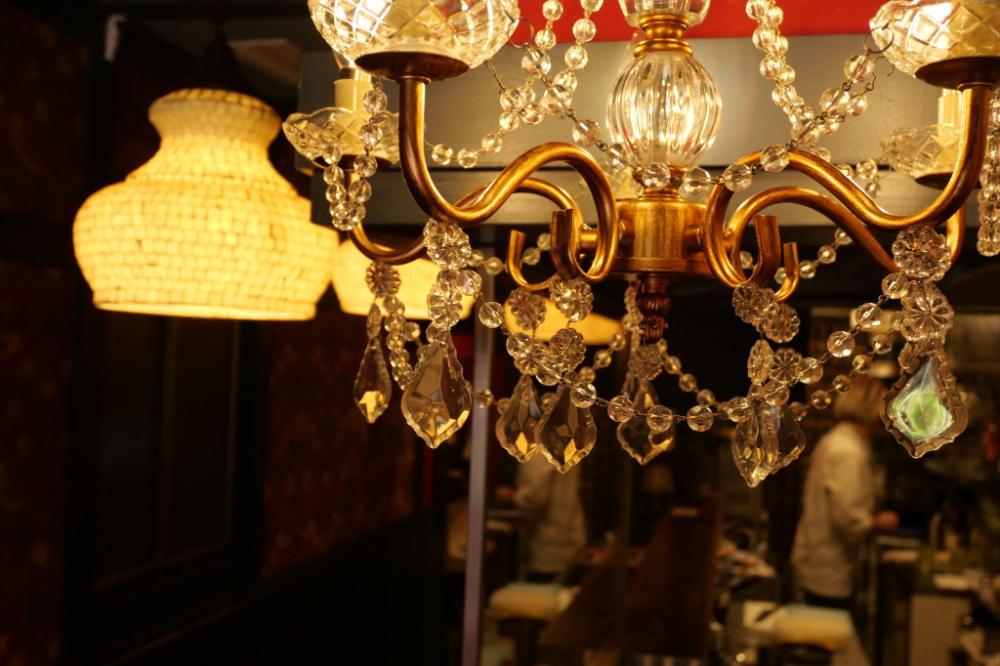 壁には店名の由来となったウィリアム・モリスの「いちご泥棒」柄の壁紙が貼られ、可愛らしさと高級感を同時に演出しています。天井から優雅に輝くシャンデリアが、さらに華やかさを添えていて、この空間にいるだけで特別な気分になれそう。