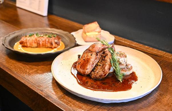 続いて、うずらのファルシ。ファルシとは「詰め物」という意味で、その名のとおり、鴨のひき肉、フォアグラ、ナッツ、ドライフルーツなどさまざまな具材が、うずらの中に詰められています。添えられているのは、贅沢な黒トリュフソース。