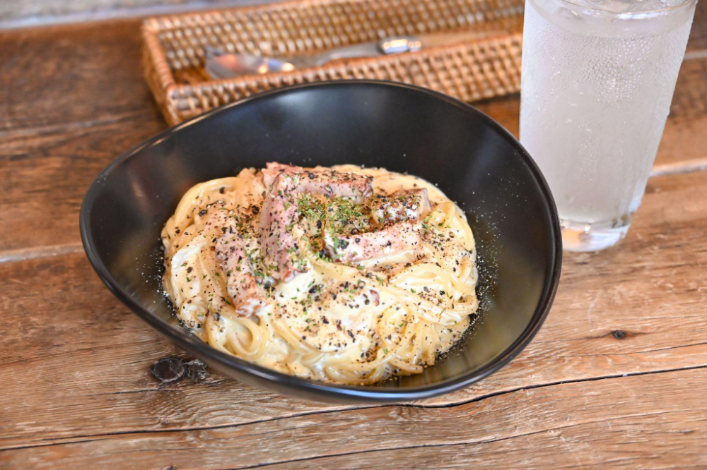 まずは、店の看板メニューである「トランジットの濃厚カルボナーラ」(1,380円)を注文。ほどよく茹でられたパスタに、クリーミーなソースがたっぷりと絡みます。一口頬張ると、濃厚なチーズの風味とベーコンの塩味が口いっぱいに広がる……!!