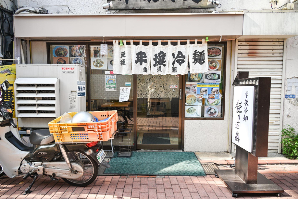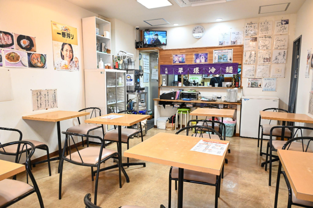 次に訪れたのは、レトロな看板が目を引く「平壌冷麺 食道園(へいじょうれいめん しょくどうえん)」。店内に入ると、昭和の雰囲気漂う懐かしい空間に、幼いころの記憶が蘇るよう。