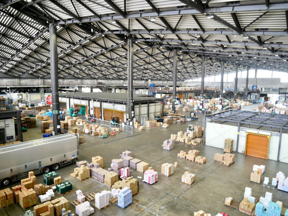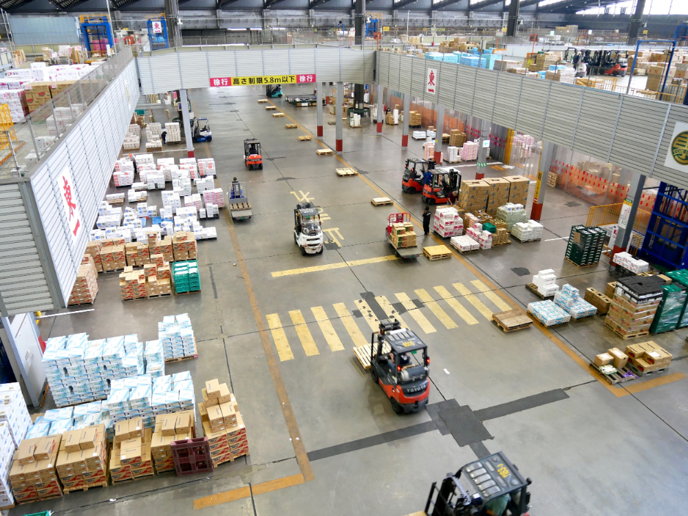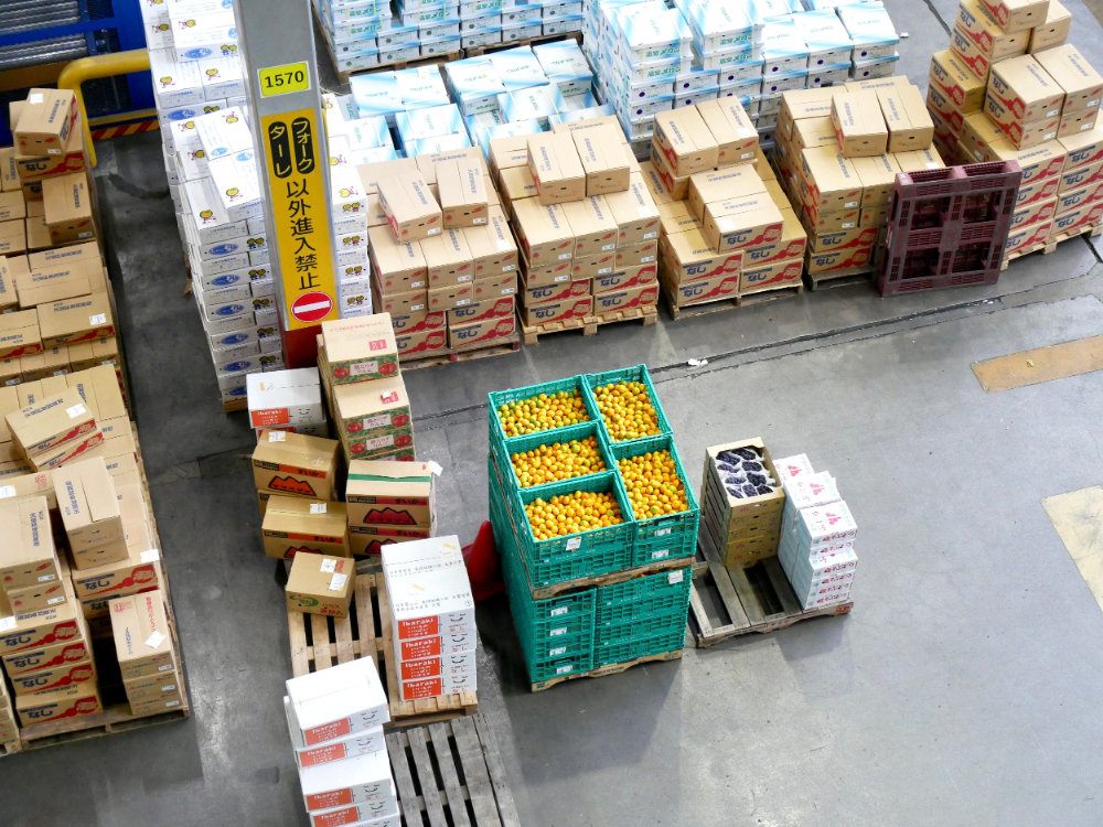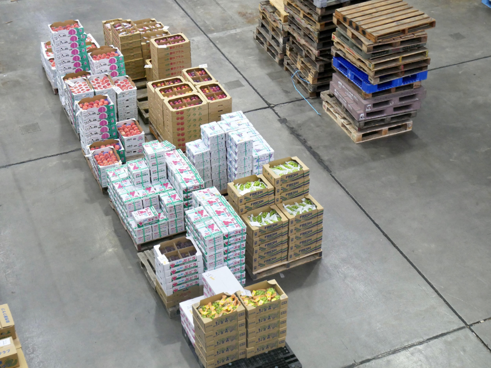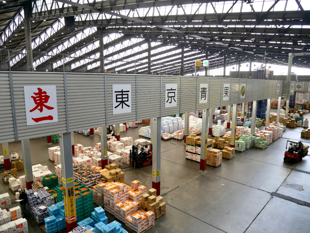 大田市場の青果棟は果物や野菜の取引がおこなわれる場所。見学した10時半ごろはせりが終了し、仲卸業者が仕分けや運搬をしているタイミングでした。