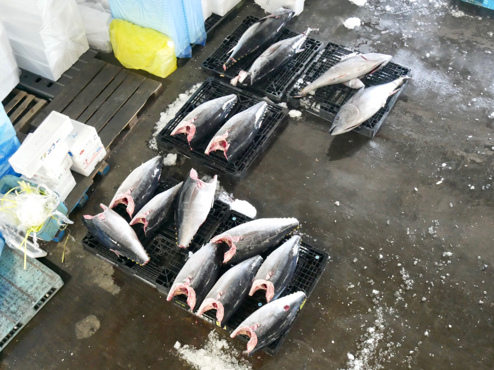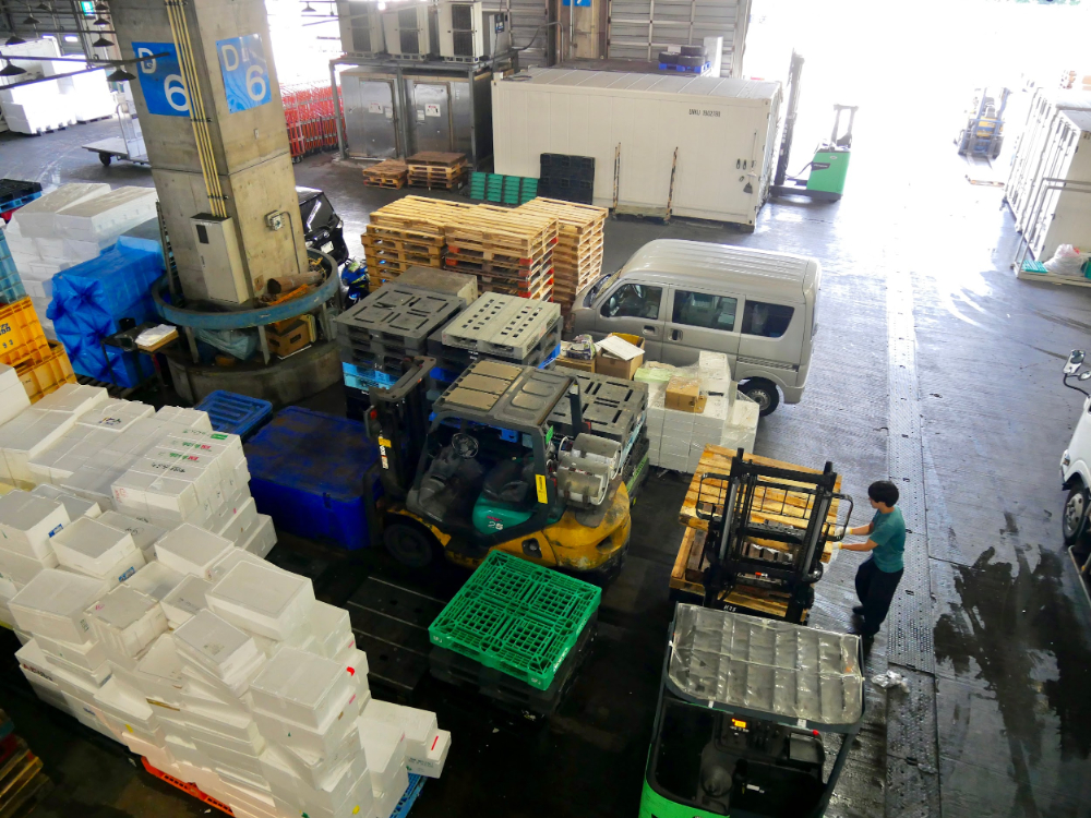 ごろんとパレットのうえに横たわるマグロたち。青果棟より見下ろす距離が近く、臨場感があります。豊洲市場だとガラス越しの見学になるので、ガラスを挟まずこの距離から見学できるのは、大田市場水産棟ならではの良さかもしれません。