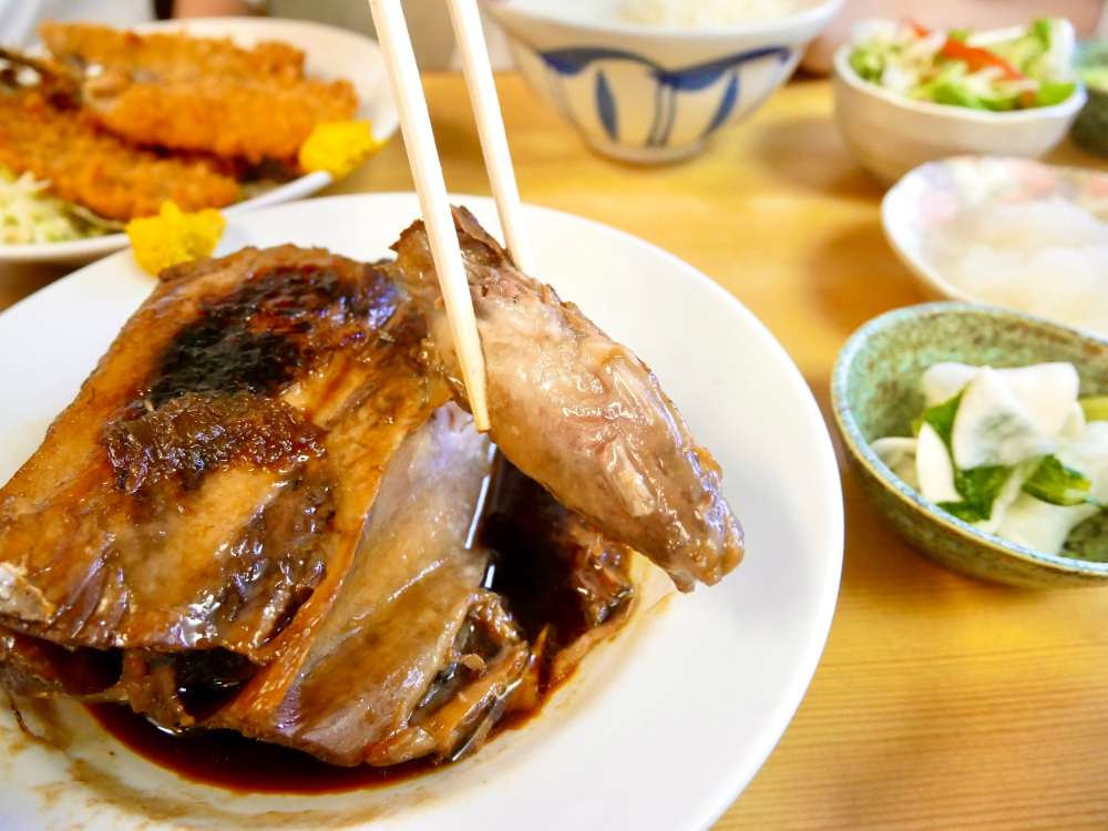 マグロのかま煮はこってりジューシーな脂の乗った本マグロに、あまじょっぱいタレがよく絡みます。こちらも冷凍せず仕入れているそう。「厳密にはかまではなく、マグロ1本につき1つしかとれない希少な『喉』の部分なんだよ」と、耳より情報も教えてもらいました。