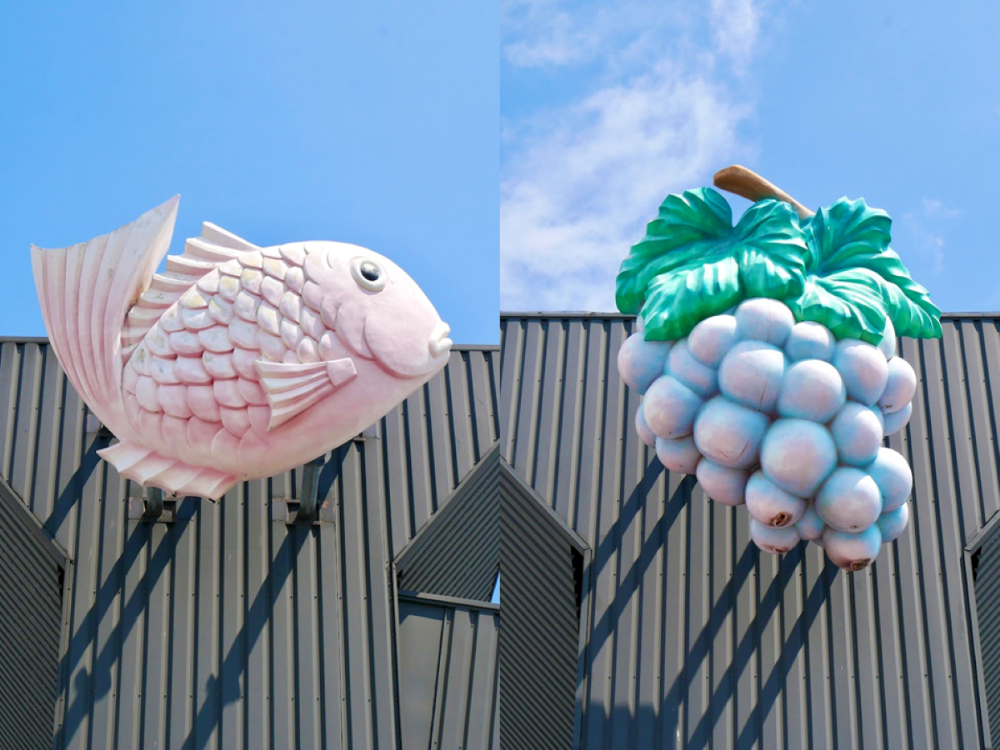 ちなみに「花き」とは、観賞用の植物全般を指す言葉。建物に花飾りがついていたのは、花の市場があったからなんですね! 花以外にも、鯛やブドウといった縁起物の「つまかざり」が各棟に掲げられていて、とてもかわいらしいんです。
