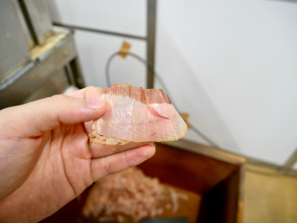 鰹節って、削りたてはこんなにツヤツヤ、ピカピカしているんですね。口に入れると、噛むたびにじゅわじゅわと濃厚な鰹のだしが染み出してきます。もう、ずっと噛んでいたい……。
