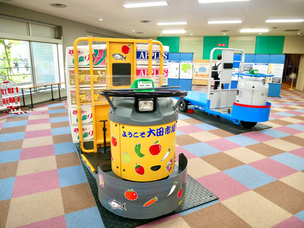 見学の最初は展示室から。市場のなかで働く車、「ターレット」が2台お出迎えしてくれます。大田市場にはターレットがおよそ1,100台、フォークリフトがおよそ1,200台も行き来しているそうです。