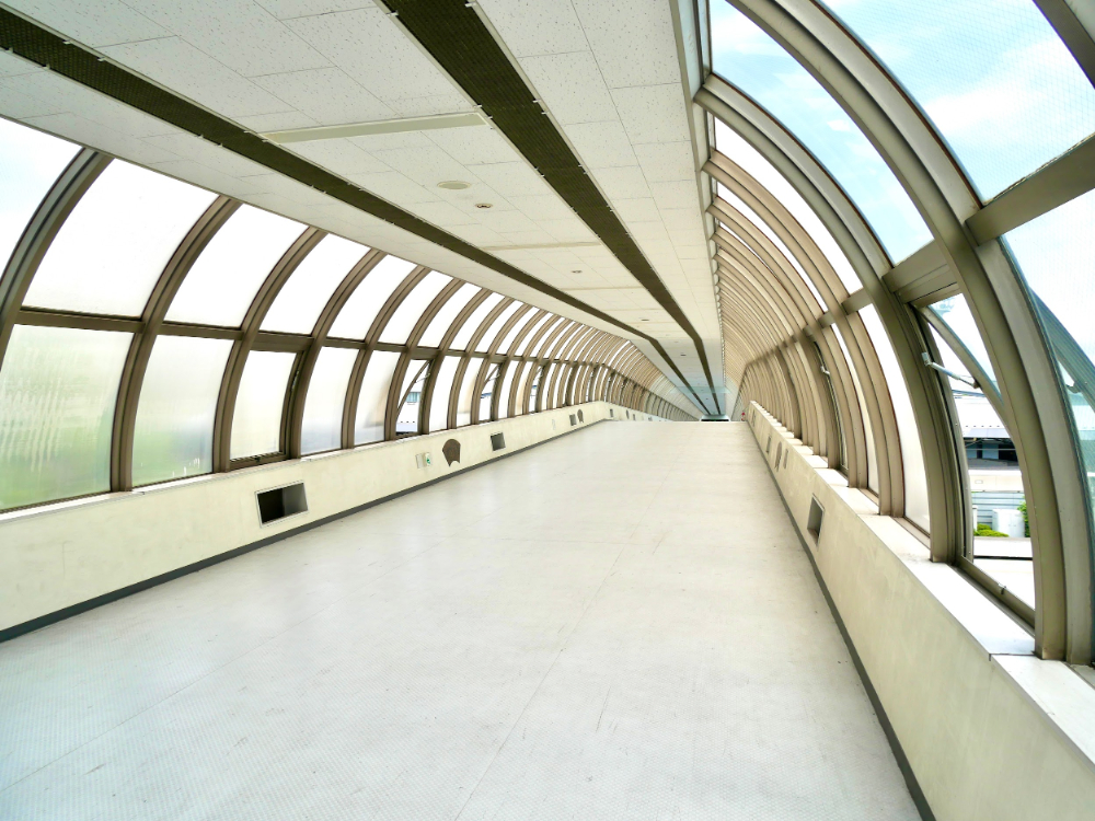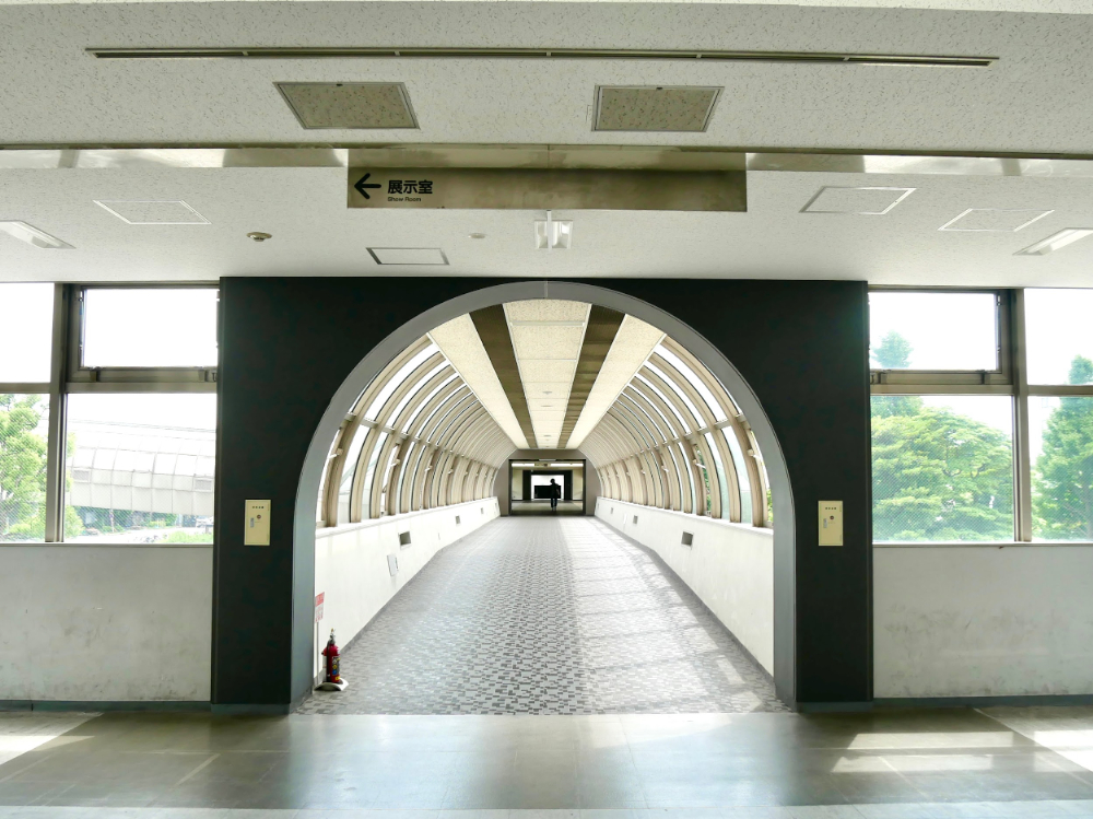 展示室の事務棟から市場棟へ渡るデッキは、ガラス張りでなんだか未来的。テーマパークでアトラクションを待っているときのようにワクワクしてきました!