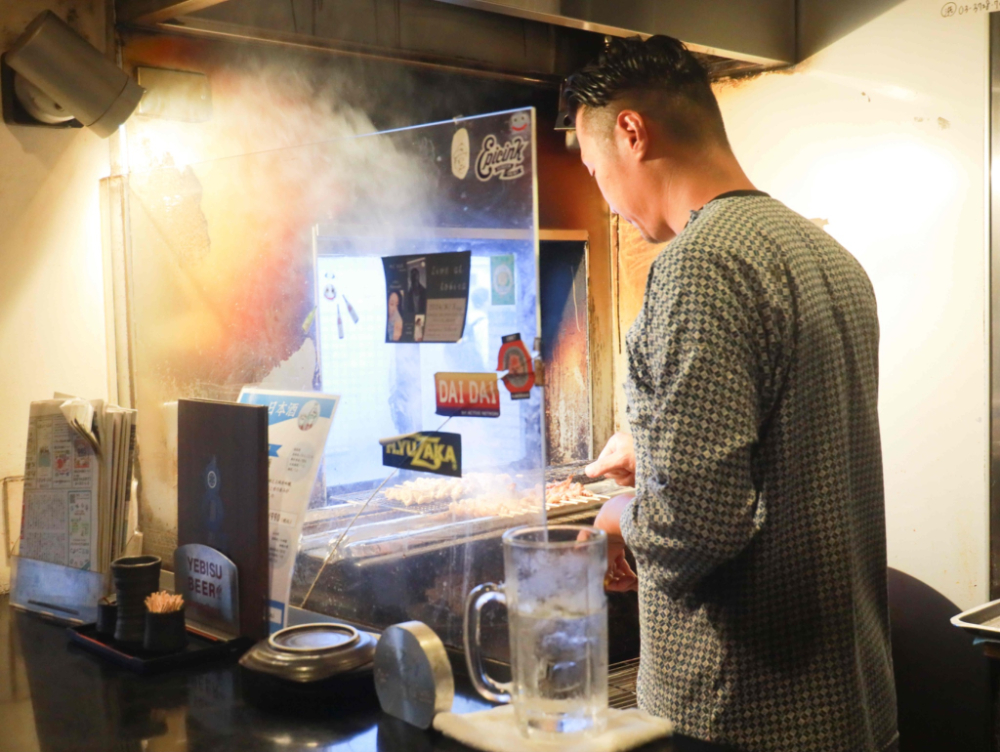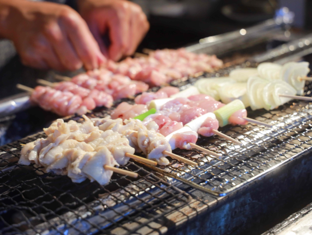 炭火で串を焼く中島さんの後ろ姿は、まさに職人そのもの。大きな背中で細かく串を動かしながら、丁寧に焼く様子に期待が高まります。
