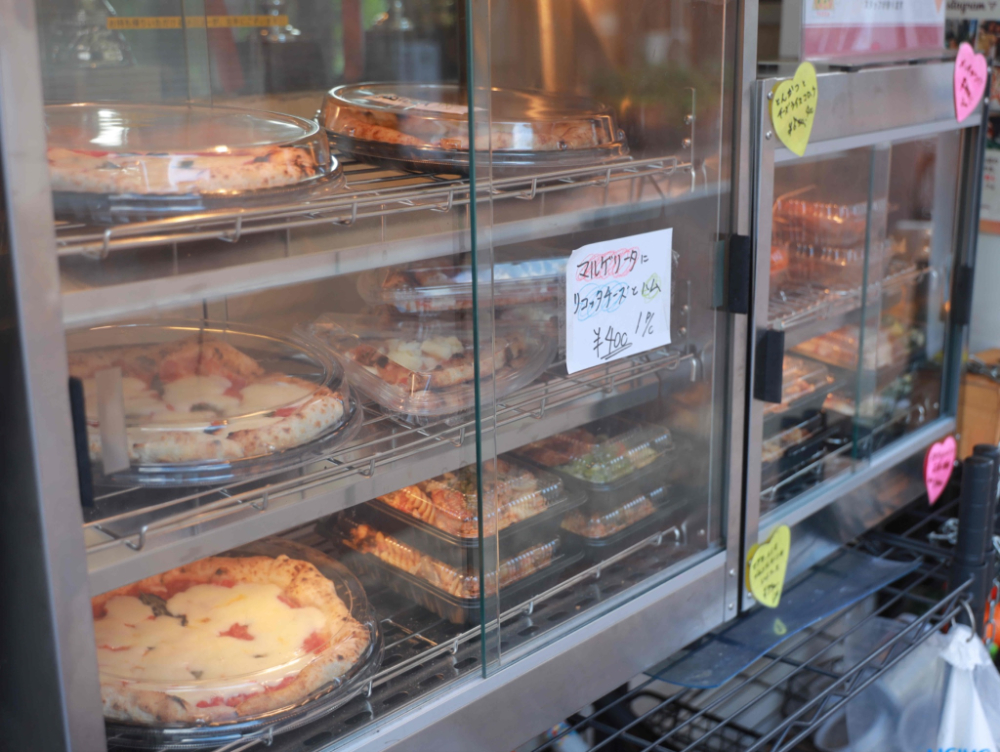店先には、テイクアウトのピッツァやイタリアンのお惣菜がずらり。「イタリアンハンバーグ 前菜2種つき」(750円)や「マグロ・しらす・ブロッコリー・きのこのトマトソースペンネ」(750円) などイタリアンならではのお惣菜は、どれもパックにみちみちに入っていて美味しそう!