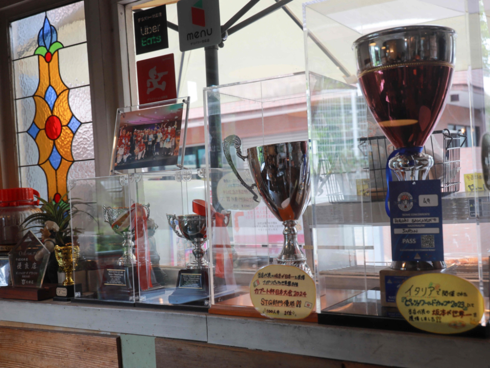 来店した誰もが気になるであろうトロフィーの数々。中でもひときわ大きなトロフィーは、オーナー坂本さんが2023年10月にローマで開催された「ピッツァワールドカップ」で受賞したものです。