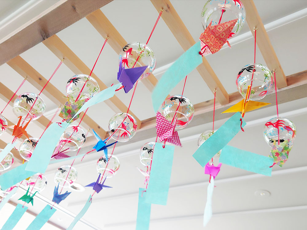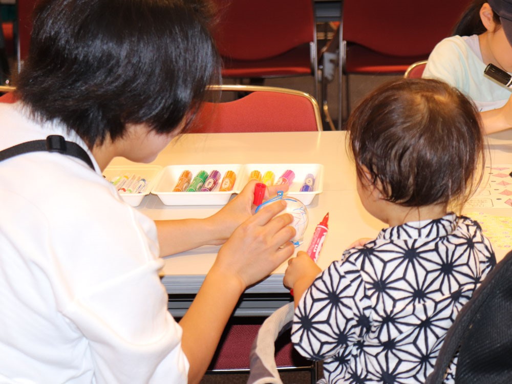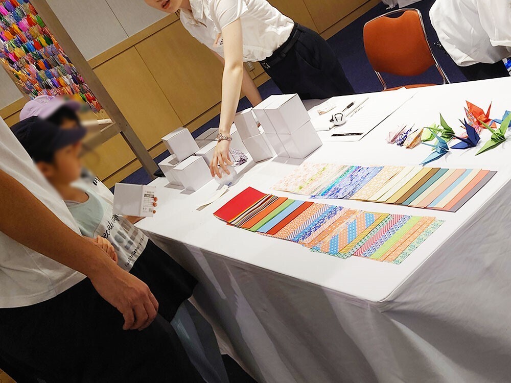 同じ会場でワークショップが開催されており、こちらは一時整理券が配布されるほど人気。親子連れの方などが、風鈴に絵を描いたり、折り鶴を折ったりしています。