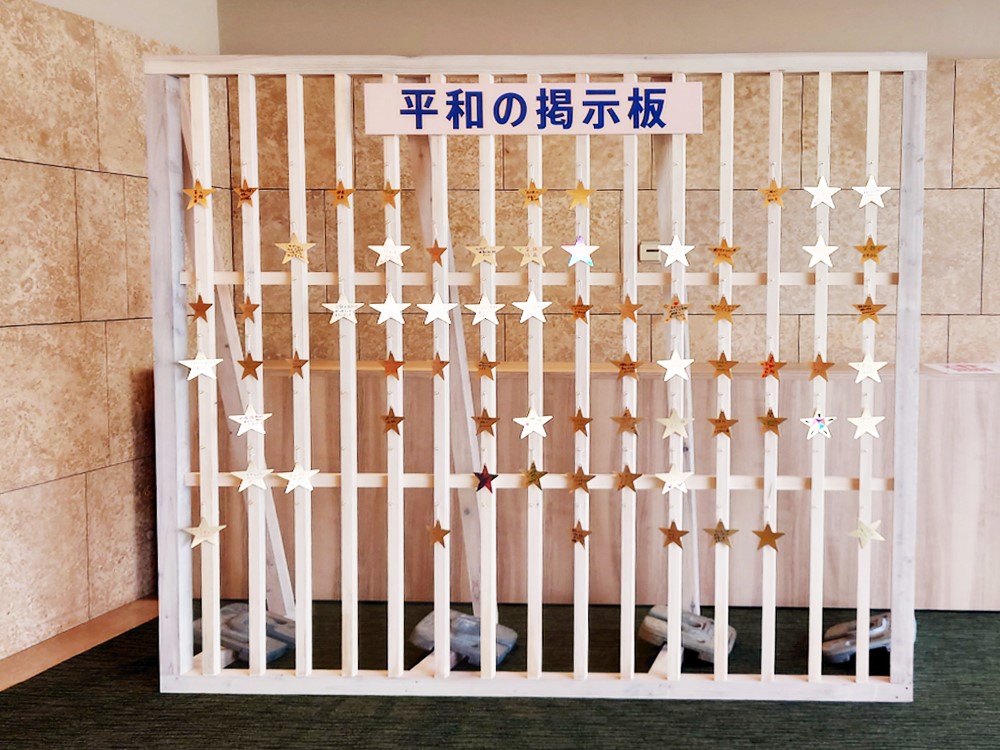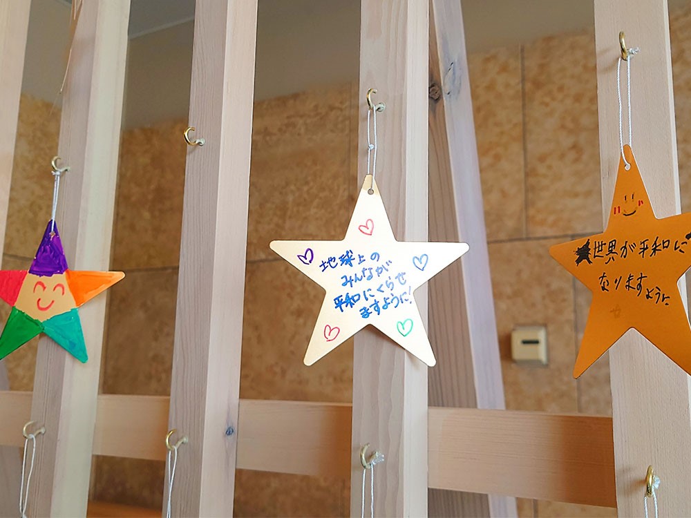 ホールへと続く、エスカレーターを登った先には、星形の短冊を飾る「平和の掲示板」があり、思い思いの平和への願いが綴られています。