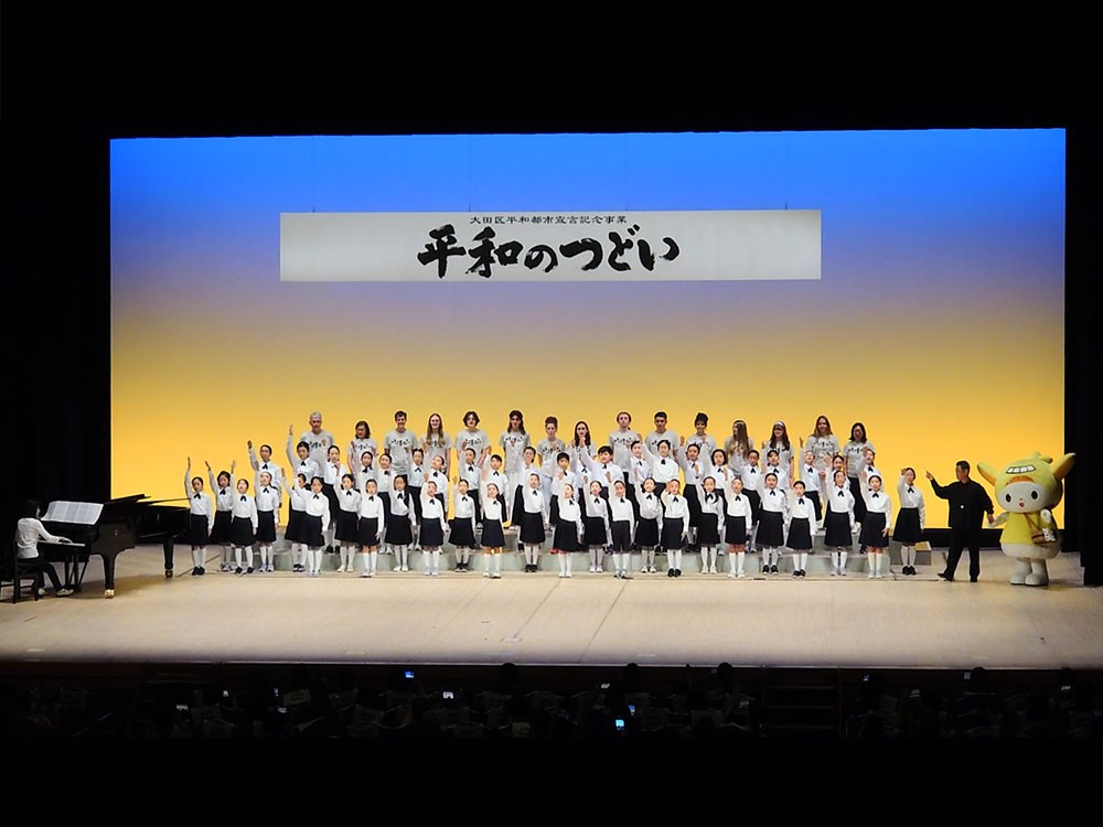 次に、東調布第三小学校合唱団と姉妹都市セーラム市学生訪問団の皆さんが参加した、手話を交えた美しい合唱が。しっとりとした雰囲気のなか、大田区公式PRキャラクター「はねぴょん」が、横で一生懸命踊っていました。