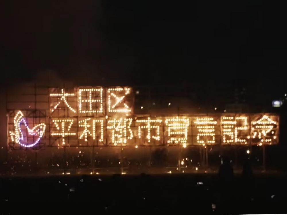 光の粒が縦横に走り、「大田区平和都市宣言記念」の仕掛け花火があらわれて、 ワァァァァ!という大きな歓声が響きます。
