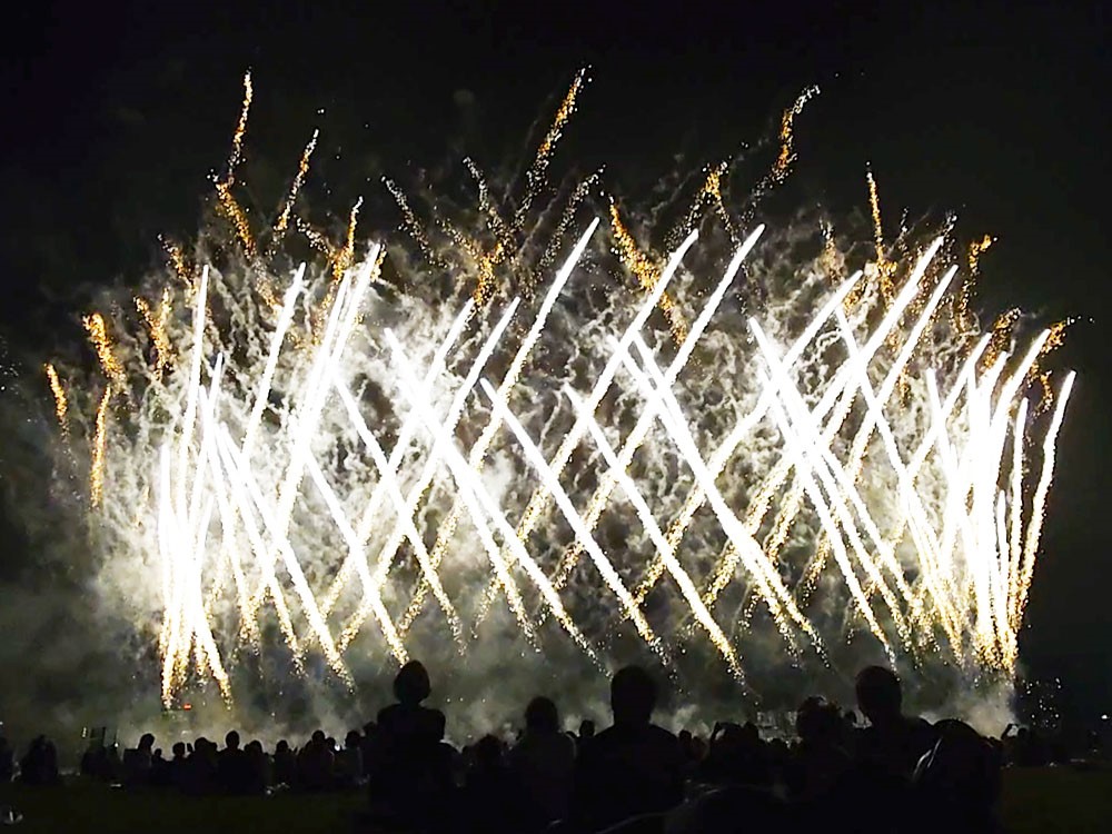 とくにこのスターマインは、国内でも珍しいと「円形」の配置を採用しているそう。並べられた花火が空に向かって円形に伸び、会場に白い光が広がっていく様は迫力があるのに幻想的。