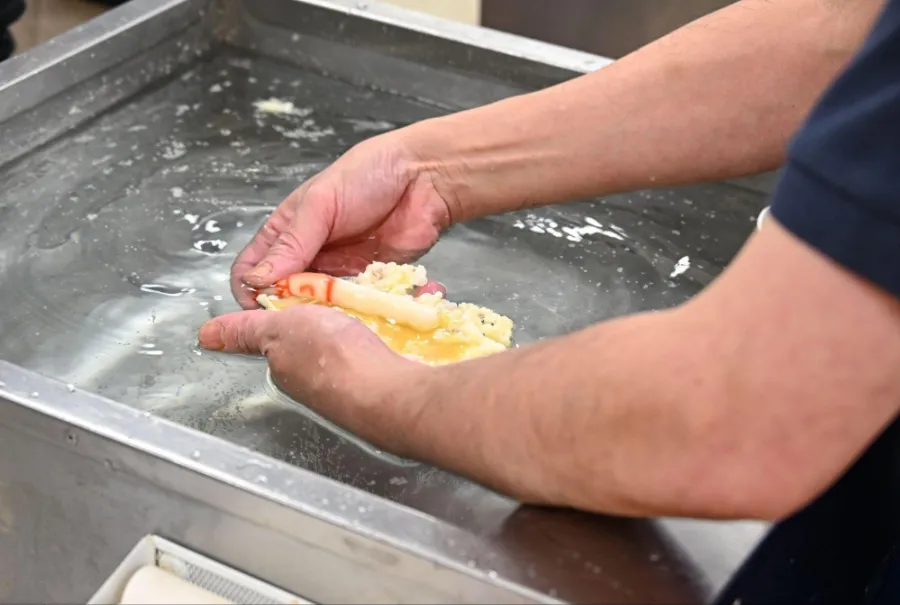 この日は「ろう」を使った昔ながらの食品サンプル技術で、本物そっくりなエビと野菜の天ぷらを作っていきます。子どもから大人まで、みんな目を輝かせながら職人さんの手元を見つめていました。